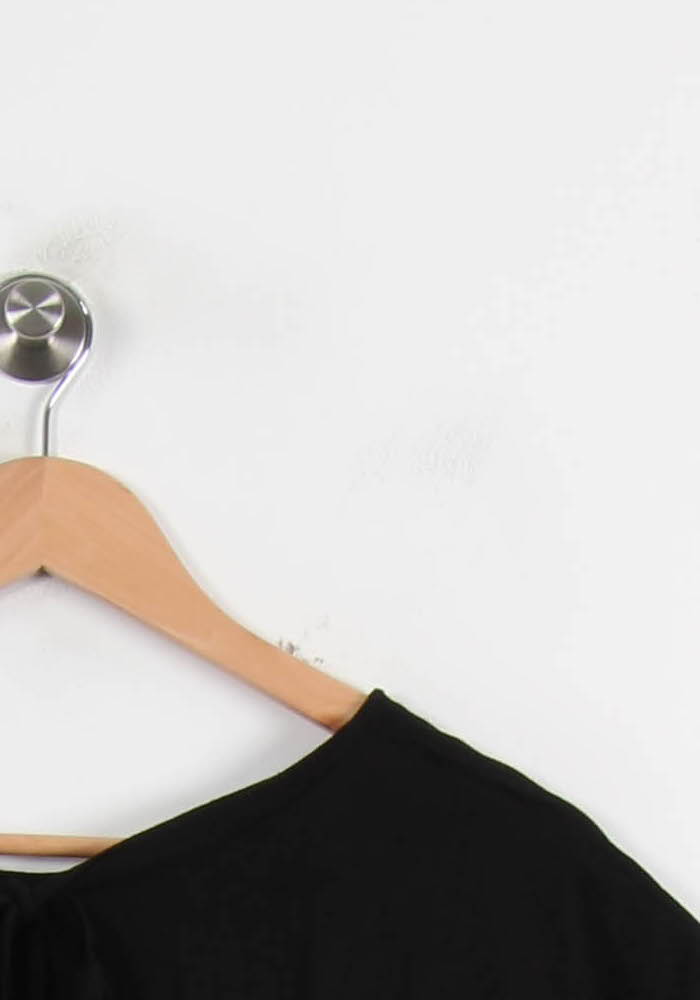 Top noir Caroll, taille S/36, à la coupe fluide et manches courtes, idéal pour un style sobre et raffiné. Sa matière légère et son encolure dotée d’un lien à nouer apportent une touche délicate et élégante, faisant de ce haut une pièce facile à porter et à accessoiriser. Parfait pour une journée de travail ou une sortie citadine, il s’adapte à toutes les occasions où l’on souhaite rester élégante tout en privilégiant le confort.