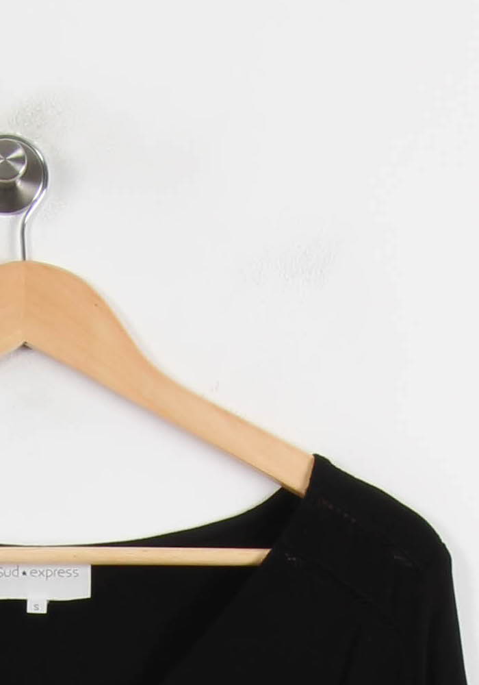 Top noir à manches courtes à volants Sud express, taille S/36. Confectionné dans une matière fluide et légère, ce top se distingue par son encolure en V élégante et ses manches aux finitions volantées, qui ajoutent une touche féminine et raffinée à la silhouette. Parfait pour une journée de travail associée à un pantalon élégant ou pour une sortie décontractée avec un jean.