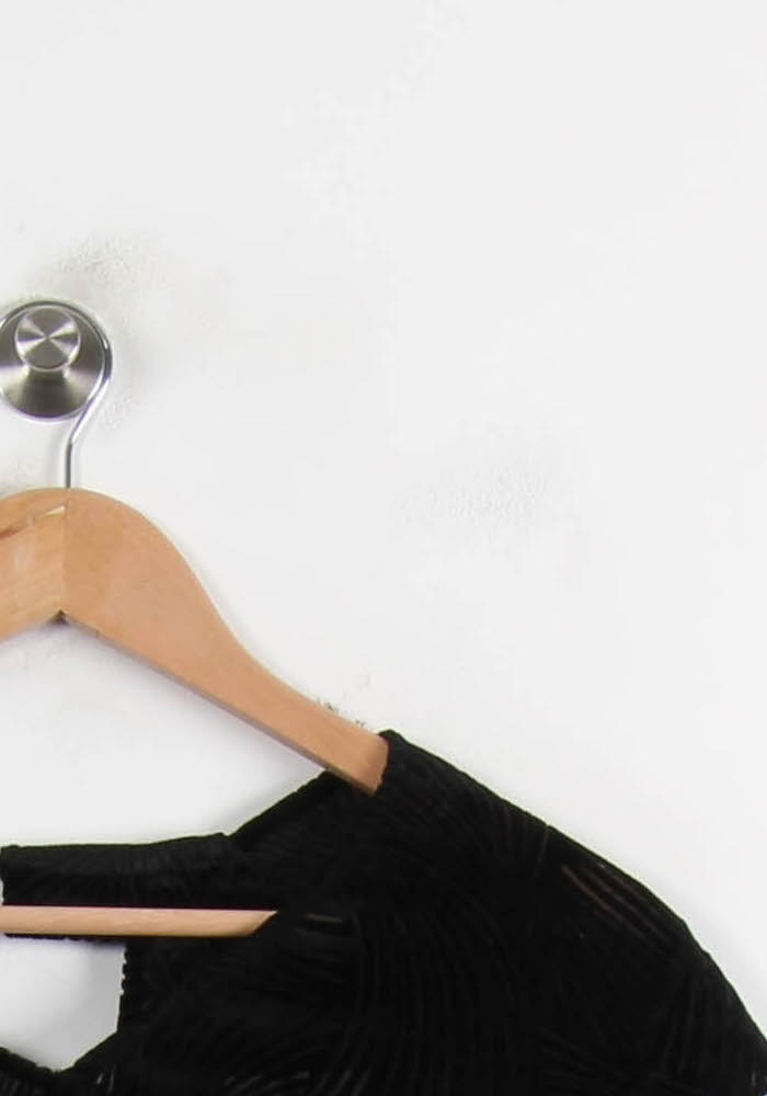 Top IKKS noir, taille S/36, à manches longues, idéal pour un look élégant et moderne. Avec une texture veloutée qui associe motifs géométriques et relief, un style raffiné et une touche unique et originale. Parfait pour une soirée chic ou un dîner entre amis, à porter avec un pantalon tailleur.