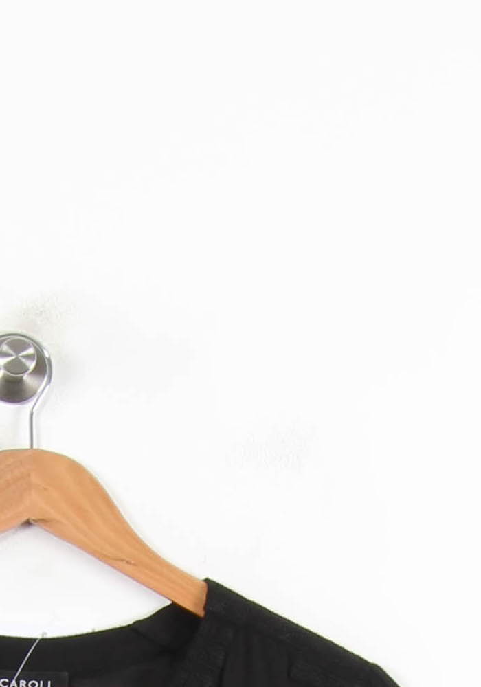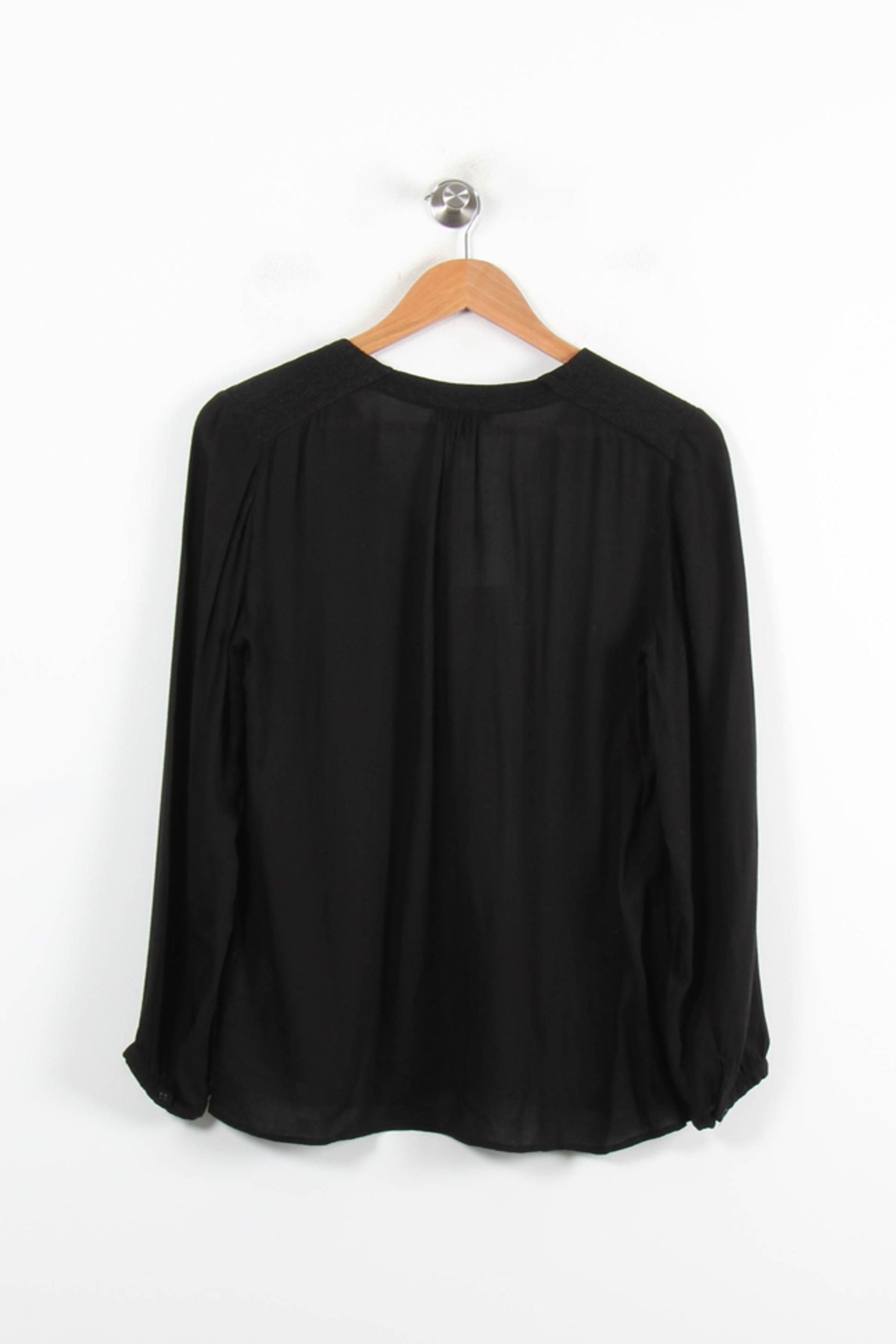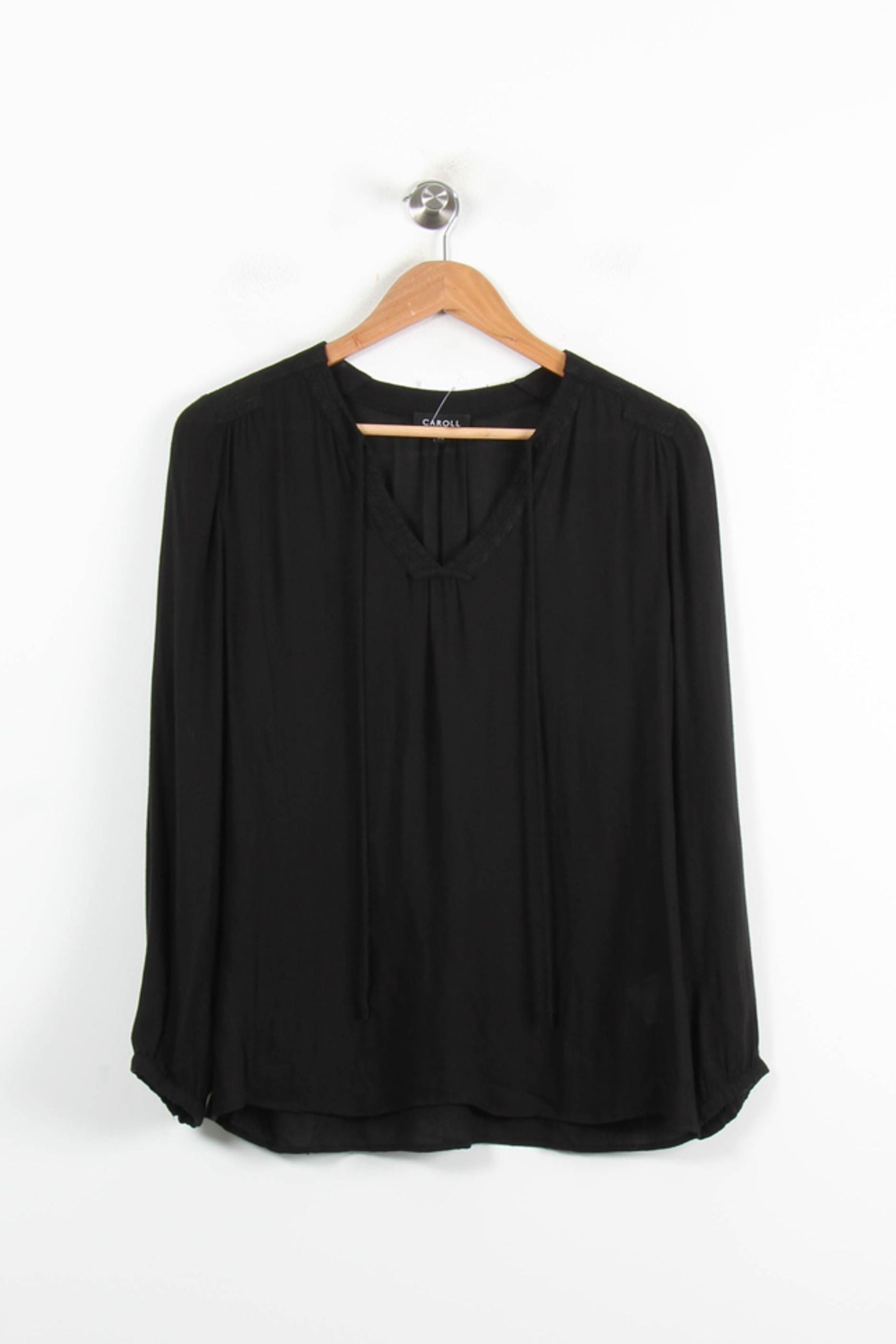 Blouse fluide noire Caroll, taille S/36, idéale pour un style élégant et intemporel. Confectionnée dans une matière légère et fluide, elle se distingue par son encolure en V subtilement travaillée et ses manches longues à la coupe légèrement ample, offrant un tombé naturel et raffiné. Ce haut se porte aisément pour une journée de travail associée à un pantalon habillé ou lors d’un dîner en ville pour une allure sophistiquée.