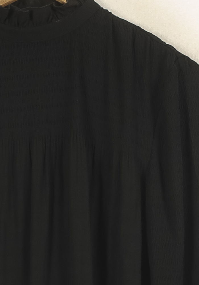 Top noir à col volanté Bérénice, taille S/36, élégant et contemporain, parfait pour sublimer les tenues du quotidien. Confectionnée dans une matière fluide, elle se distingue par les détails délicats des pièces plissées et smockées, qui ajoutent une touche de raffinement et une silhouette féminine. Idéal pour un usage quotidien par un professionnel ou dans un environnement chic, avec l'adaptateur sauna haut de gamme pour les occasions spéciales.