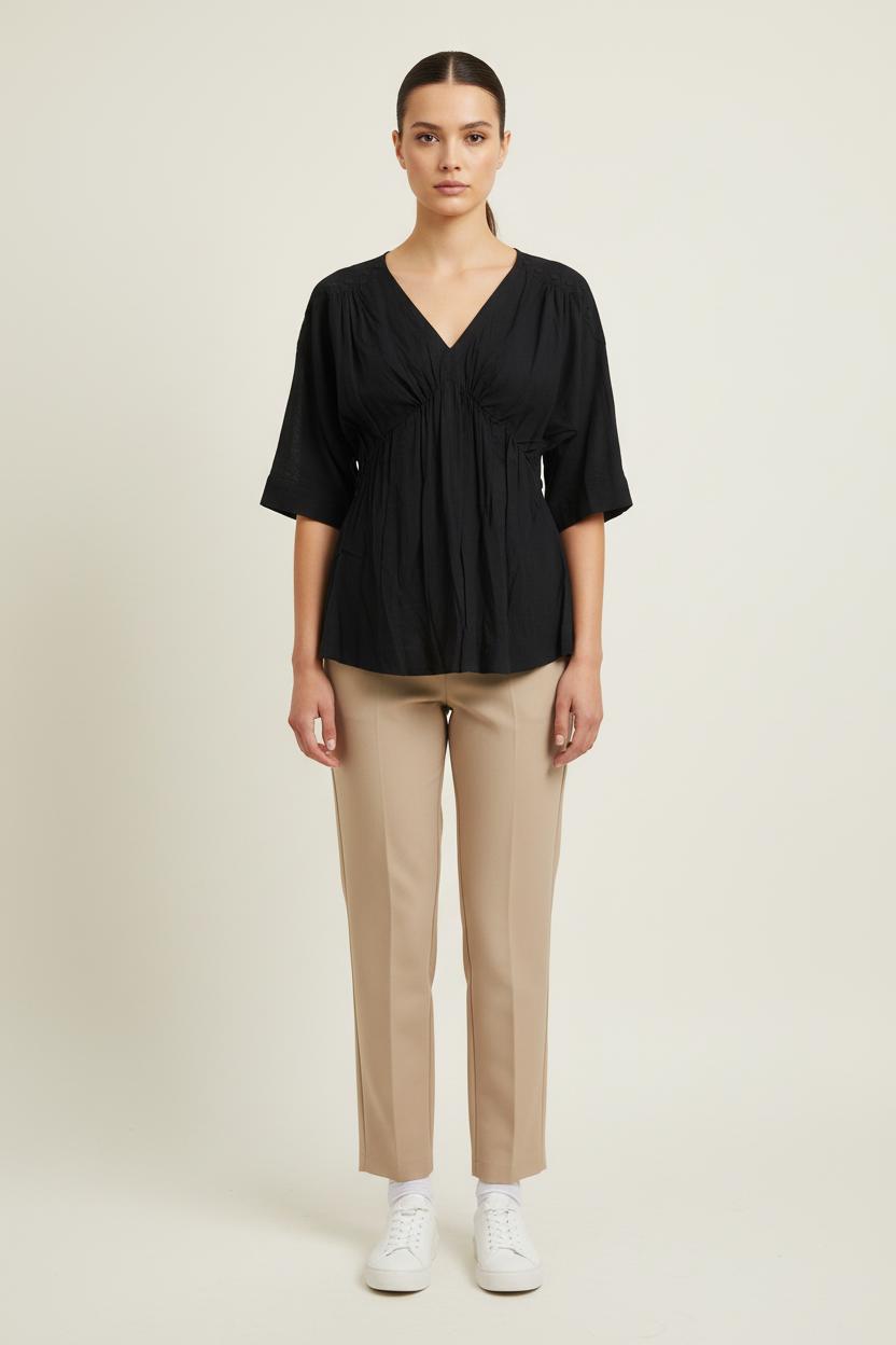 Top noir Bérénice, taille S/36, coupe ample avec manches mi-longues et encolure en V. La réalisation d'un produit fini exige une attention particulière aux détails subtils des contours de la taille et à l'apparence de l'élégance et de l'originalité de la silhouette. Idéal pour une journée au bureau ou une mission contractuelle à la campagne.