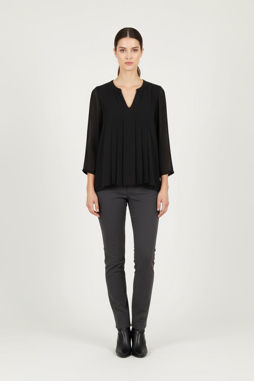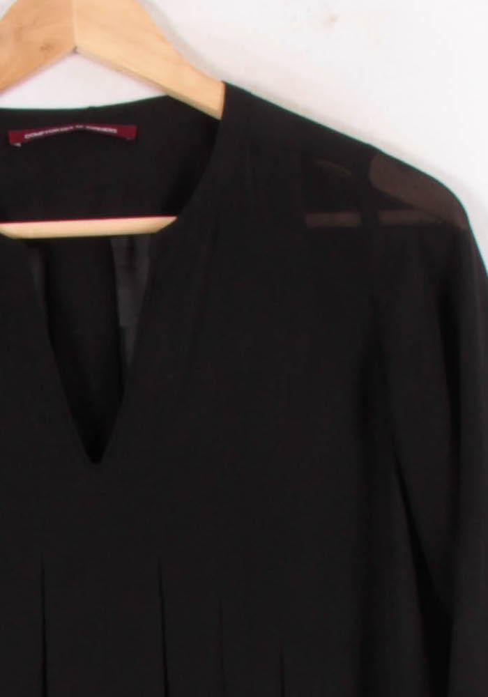Top noir Comptoir des Cotonniers en taille S/36, à manches longues et col en V, alliant élégance et modernité. La production d'un fluide fluide, la méthode utilisée est affinée selon les raffinements verticaux du design et les empiècements sont transparents, subtils au niveau de l'épaule, apportant au toucher de l'original et à la légèreté. Idéal pour une journée de travail avec un pantalon élégant ou pour une soirée sublime avec un look chic.