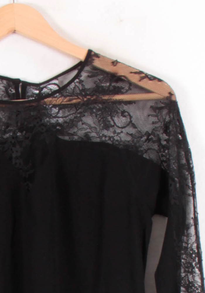 Top noir en dentelle, modèle de la marque Maje, taille S/36. Elle se distingue par son aspect, son encolure et sa dentelle délicate, avec une touche de raffinement et de féminité, et son corps reste opaque pour un contraste élégant. Parfait pour un look décontracté et un événement chic, avec un pantalon élégant et une allure décontractée.