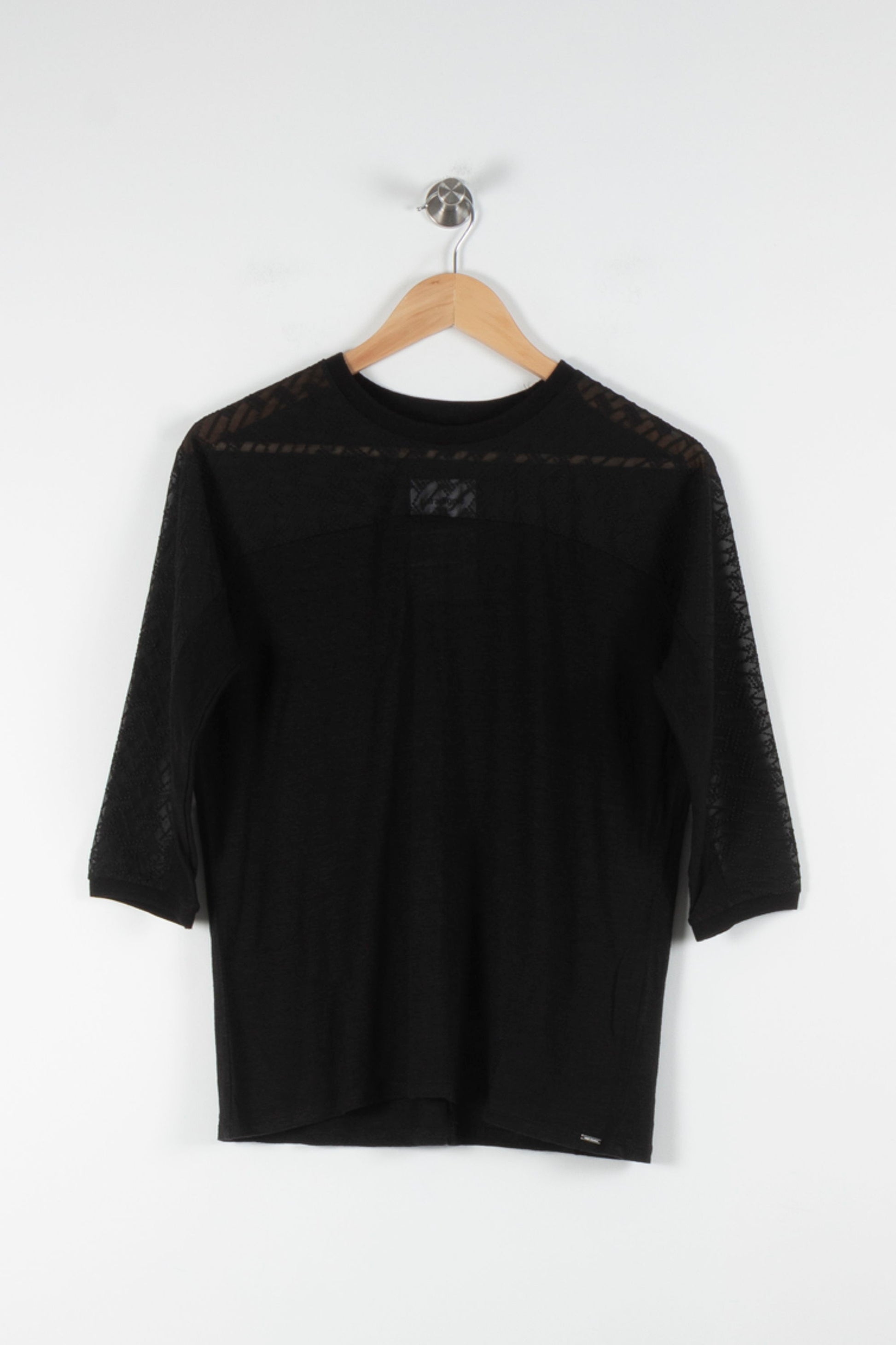 IKKS haut noir et taille S/36, en trois-quartz et col roulé rond. La matière est délicate au niveau des empiècements et de la transparence de l'épaule et les manches apportent une touche d'originalité et d'élégance à ce modèle intemporel. Idéal pour une réunion professionnelle ou une soirée chic et plutôt simple.