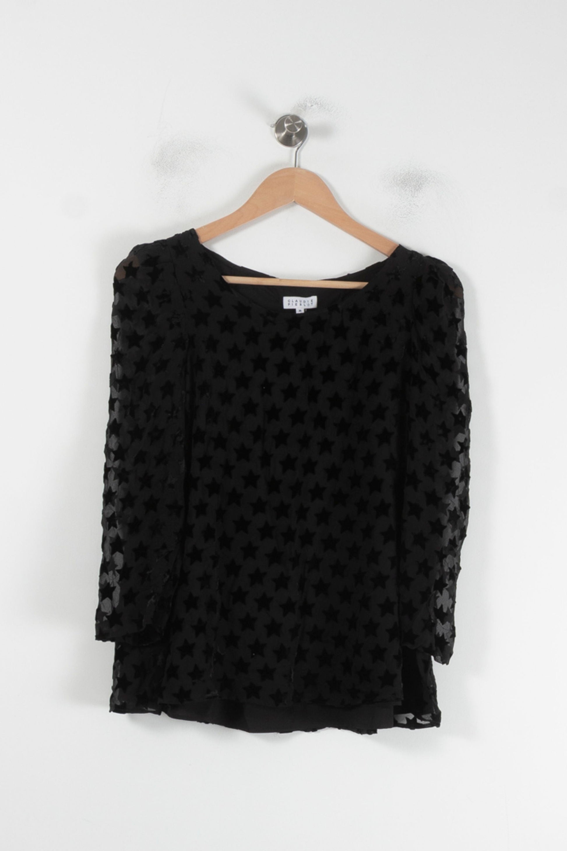 Top noir à motifs étoiles Claudie Pierlot, taille S/36, à la coupe droite et au design raffiné. Confectionné dans un tissu composé principalement de 55 % de viscose et de 45 % de polyester double couche, présentant un motif et un relief empreints d'originalité et de délicatesse. Idéal pour une soirée élégante avec un dîner chic, à porter avec un pantalon ou une jupe habillée.