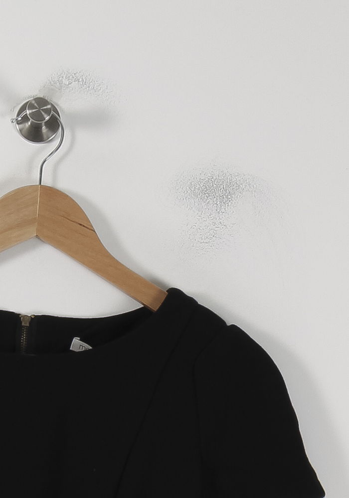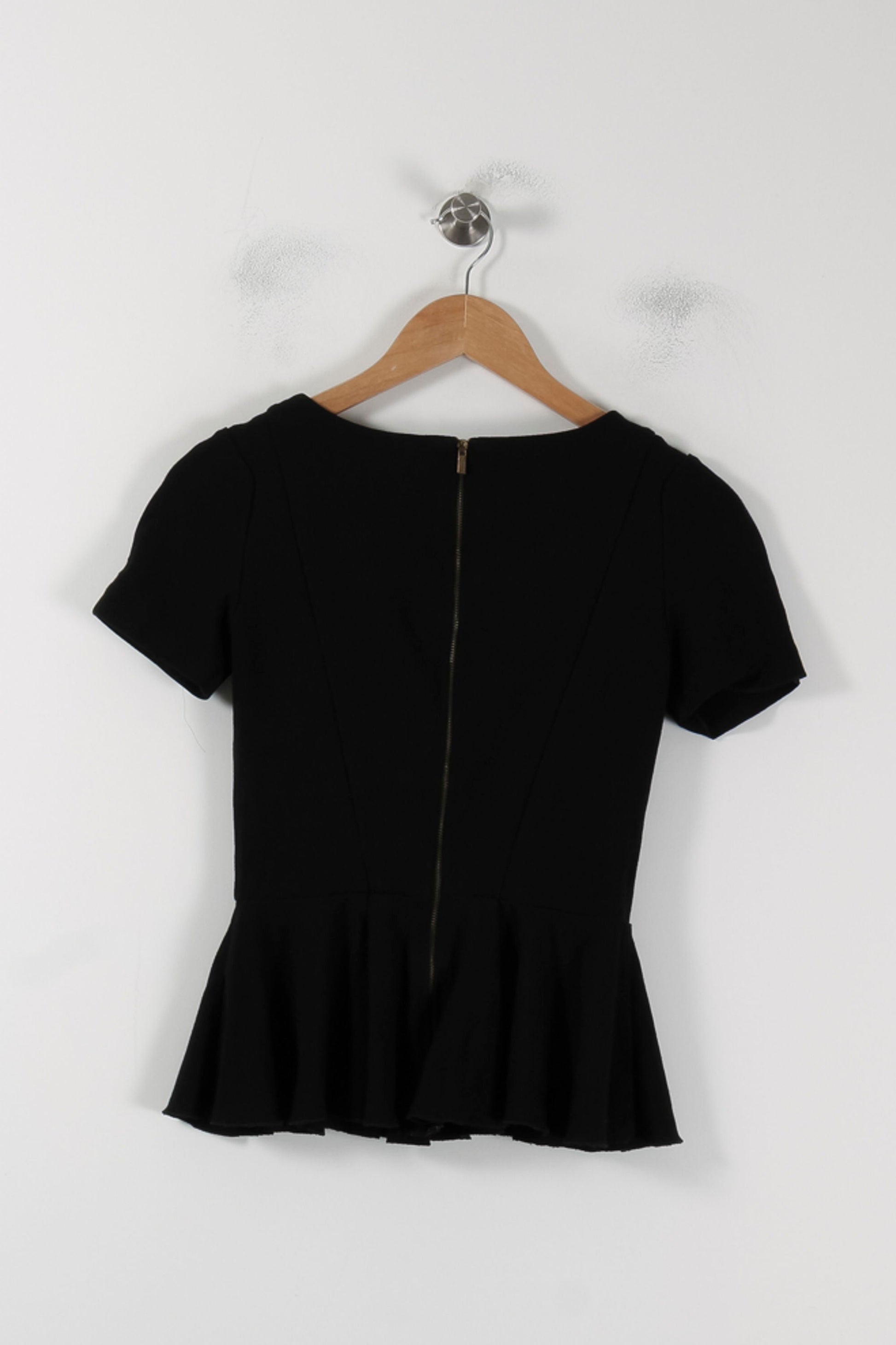 Top noir à basque Maje, taille S/36, alliant élégance intemporelle et raffinement. La fluidité des lignes, la structure du coupé et la finition soignée du châssis révèlent une silhouette féminine et un style contemporain. Idéal pour un dîner chic ou un dîner entre amis, dans une ambiance décontractée, alliant simplicité et sophistication.
