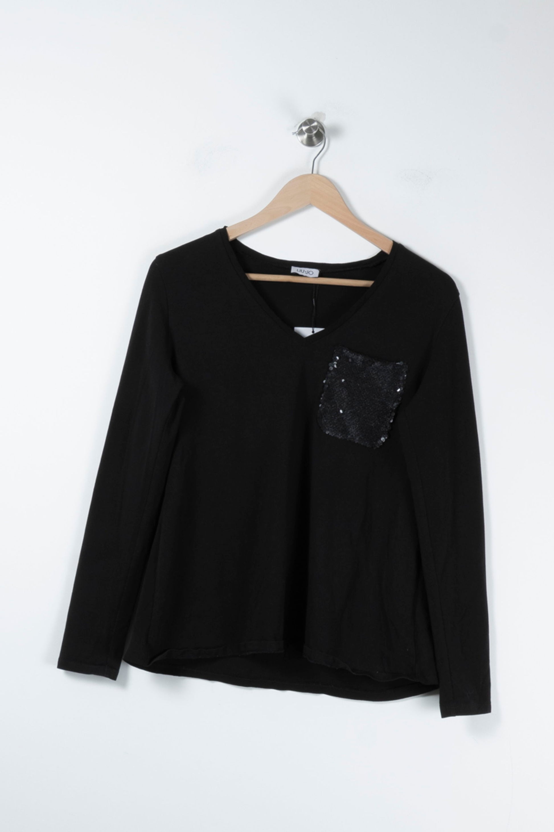 Top noir Liu Jo en manches longues, taille S/36, orné d'une poche à sequins qui apporte une touche d'originalité à ce basique élégant. Composée à 95 % de coton et à 5 % d'élasthanne, elle offre un confort optimal et une coupe ajustée, tandis que les sequins forment un ensemble sophistiqué et lumineux. Idéal pour une soirée décontractée lors d'un dîner en ville, avec une tenue sublime alliant discrétion et raffinement.