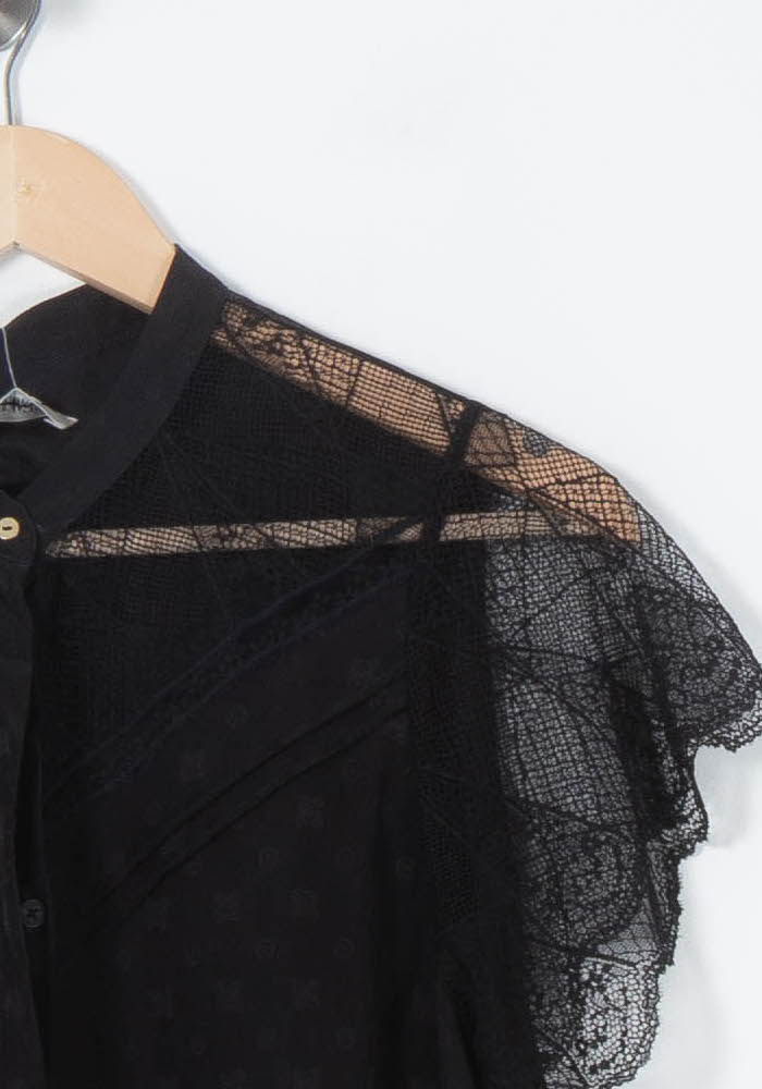 Blouse noire en coton avec empiècements en dentelle, taille S/36, signée Zadig&Voltaire. Confectionné à partir du tissu principal 100% coton et fini avec de la dentelle (95% polyamide, 5% élasthanne) avec les finitions, les détails et les raffinements. Idéal pour un look élégant et une occasion spéciale, alliant sophistication et modernité.