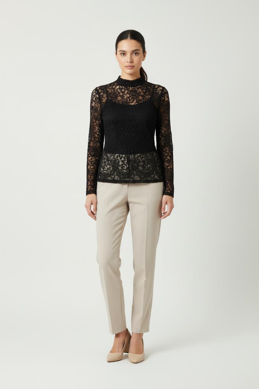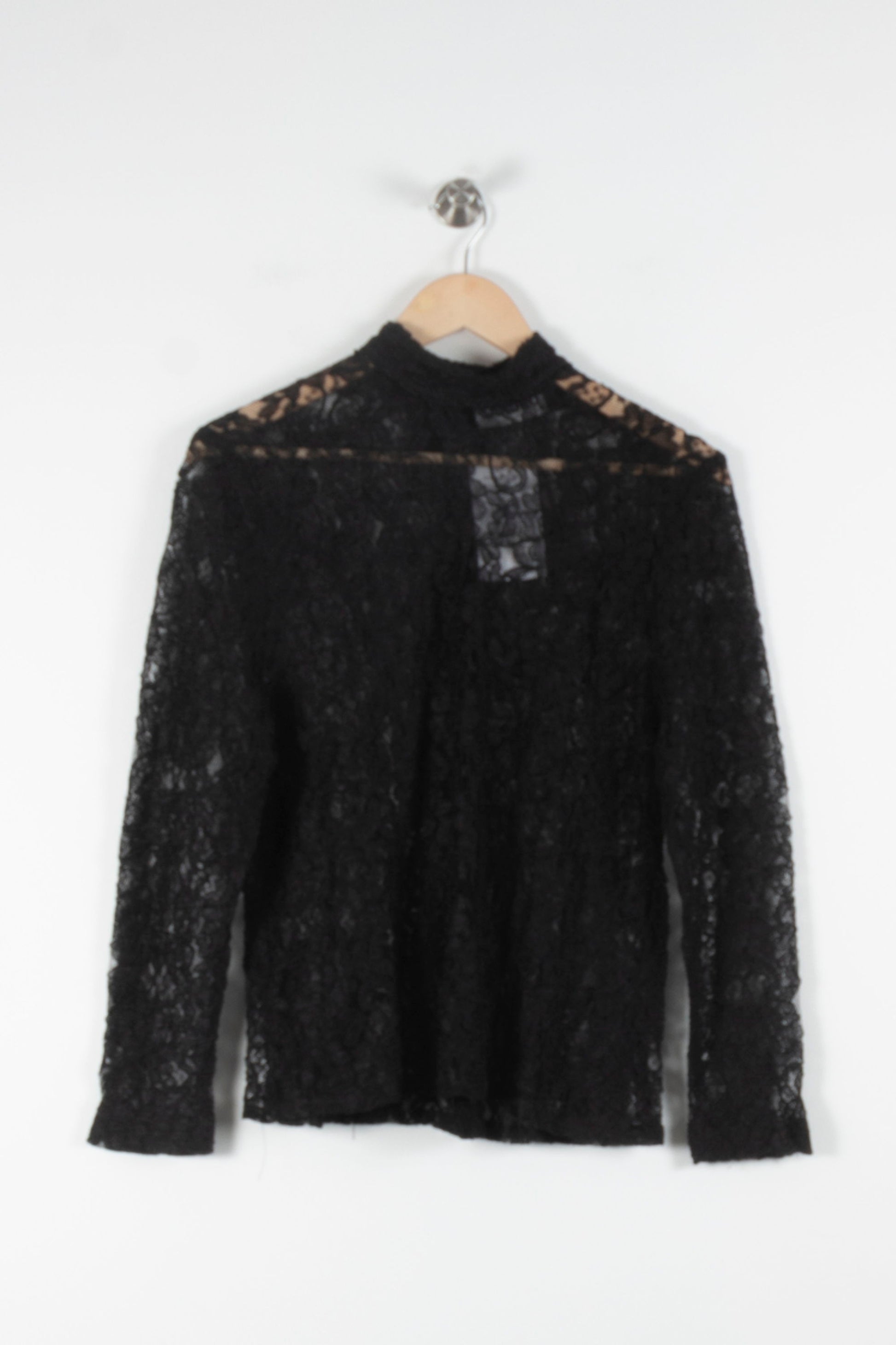 Top et dentelle noire Sandro, taille unique, à manches longues. Une confiserie à la finition délicatement transparente, une présentation haut de gamme avec un col et un jeu de transparence raffiné, avec la valeur ajoutée du savoir-faire de la marque Sandro. Idéal pour un look élégant et une expérience confortable, alliant sophistication et modernité.