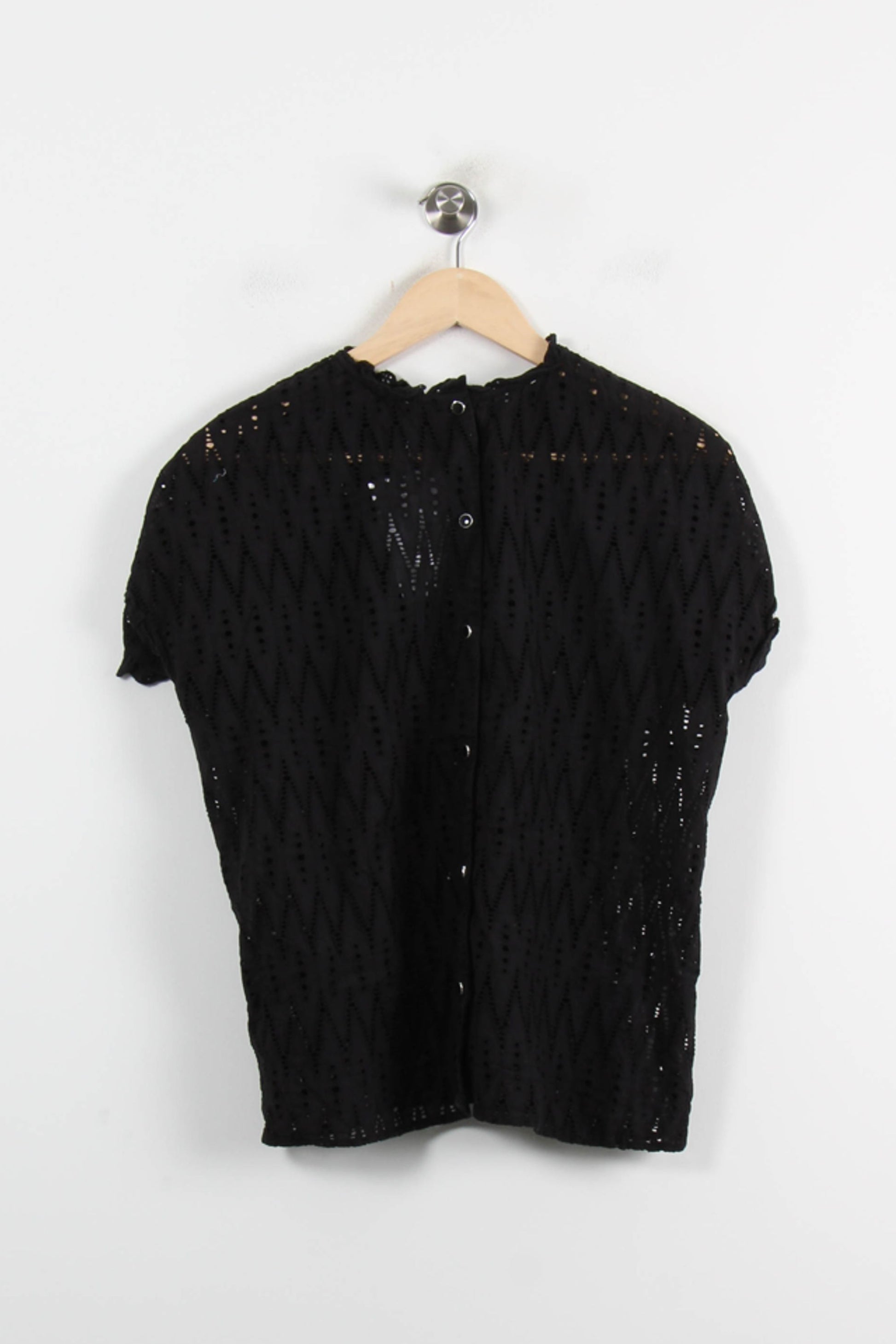 Top ajouré noir One Step, taille XL/42, confectionné dans une matière légère et élégante. Le motif, avec sa perforation délicate, ses motifs géométriques et ses zigzags, ainsi que les formes qui le composent, lui confèrent une allure raffinée et une touche d'originalité. Idéal pour une soirée décontractée, avec un pantalon élégant et un look jeune.