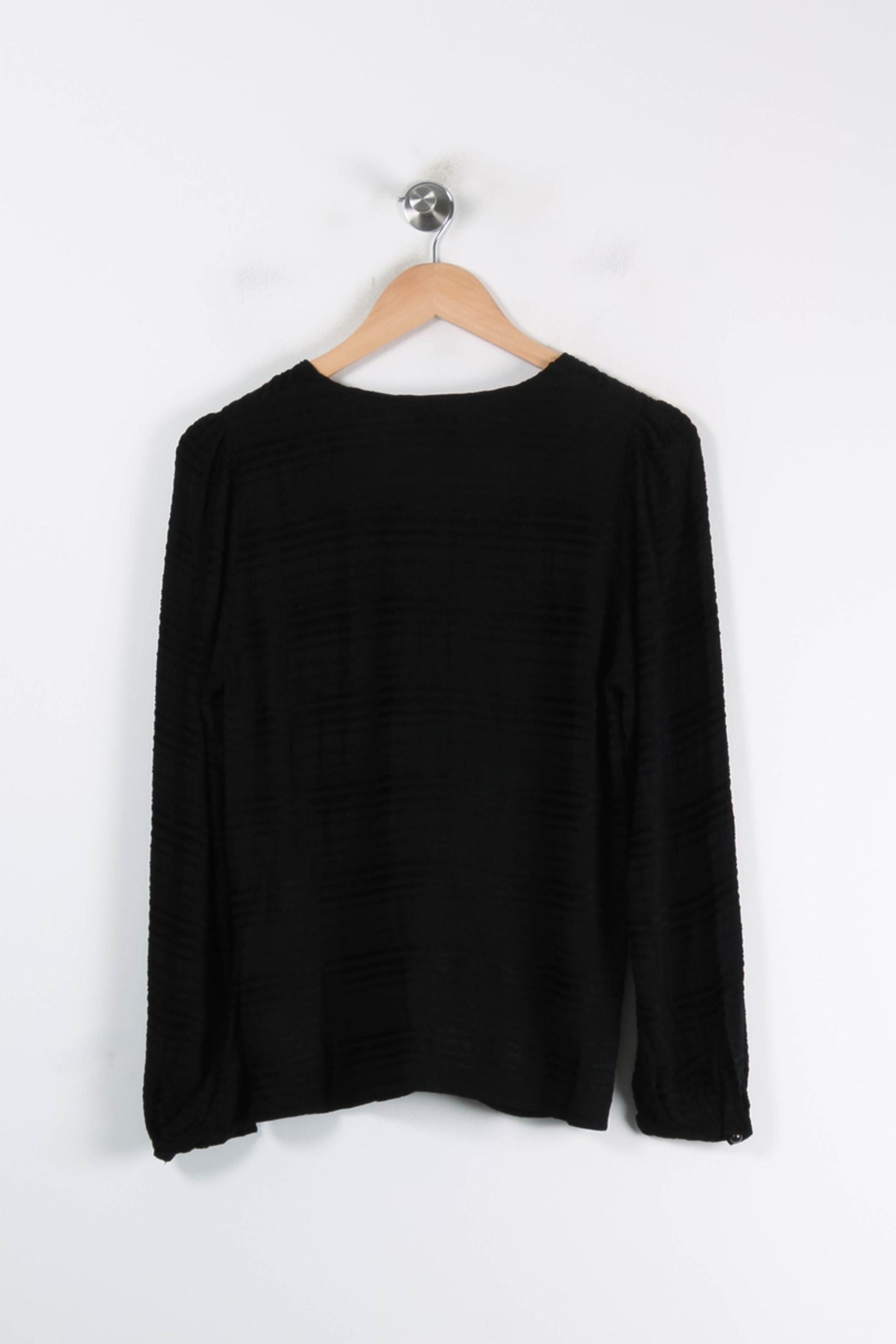 Top noir La Fée Maraboutée, taille XL/42, à manches longues, au design épuré et col en V. Confectionné en 100% viscose, ce modèle se distingue par sa texture légèrement ajourée au niveau des épaules et sa matière fluide qui apporte élégance et confort. Idéal pour une journée au bureau ou une sortie en soirée, il s'accorde autant avec un pantalon habillé qu’avec un jean.