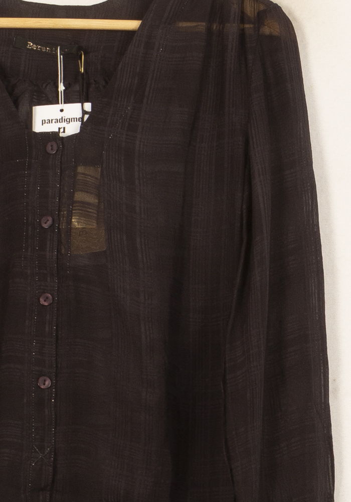 Top noir transparent Bérénice, taille XS/34, élégant et raffiné, idéal pour une allure sophistiquée. Une confection réalisée dans une matière légère et fluide, offrant une présentation soignée et un délicat effet de plissé et de transparence, avec des boutonnières longue tenue qui témoignent de la finesse de ses finitions. Parfait pour un dîner chic, il apportera la touche finale et une note de raffinement à votre tenue.