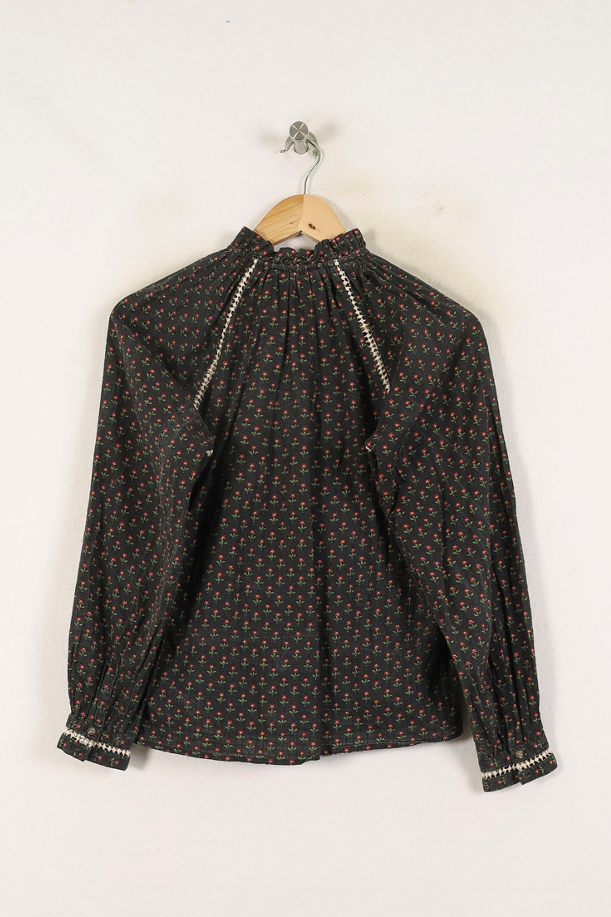 Blouse noire à motifs fleuris Sézane, taille XS/34, au style raffiné et contemporain. La confection de la matière première se fait avec les détails délicats de la broderie blanche de la longue boutonnière et des épaules, qui résultent des plis et des points auxiliaires qui créent un charme unique. Idéal pour une journée de travail ou une journée élégante en ville.