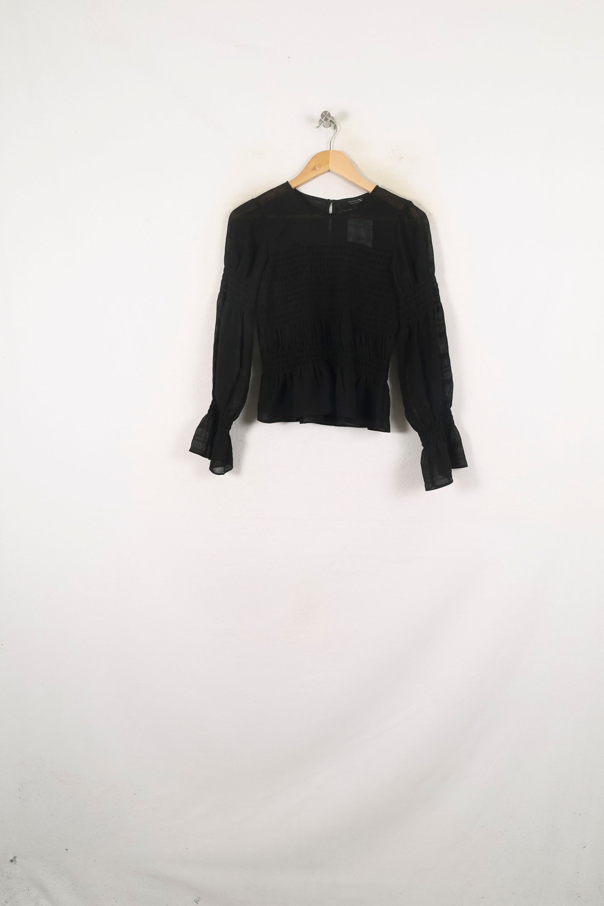 Top noir à manches longues All Saints, taille XS/34, élégant et raffiné, parfait pour une silhouette féminine. Le jeu de matières et de transparences associé aux plis et au buste crée une allure sophistiquée et unique, idéale pour sublimer une tenue. Ce haut est idéal pour un dîner chic ou un événement semi-formel.