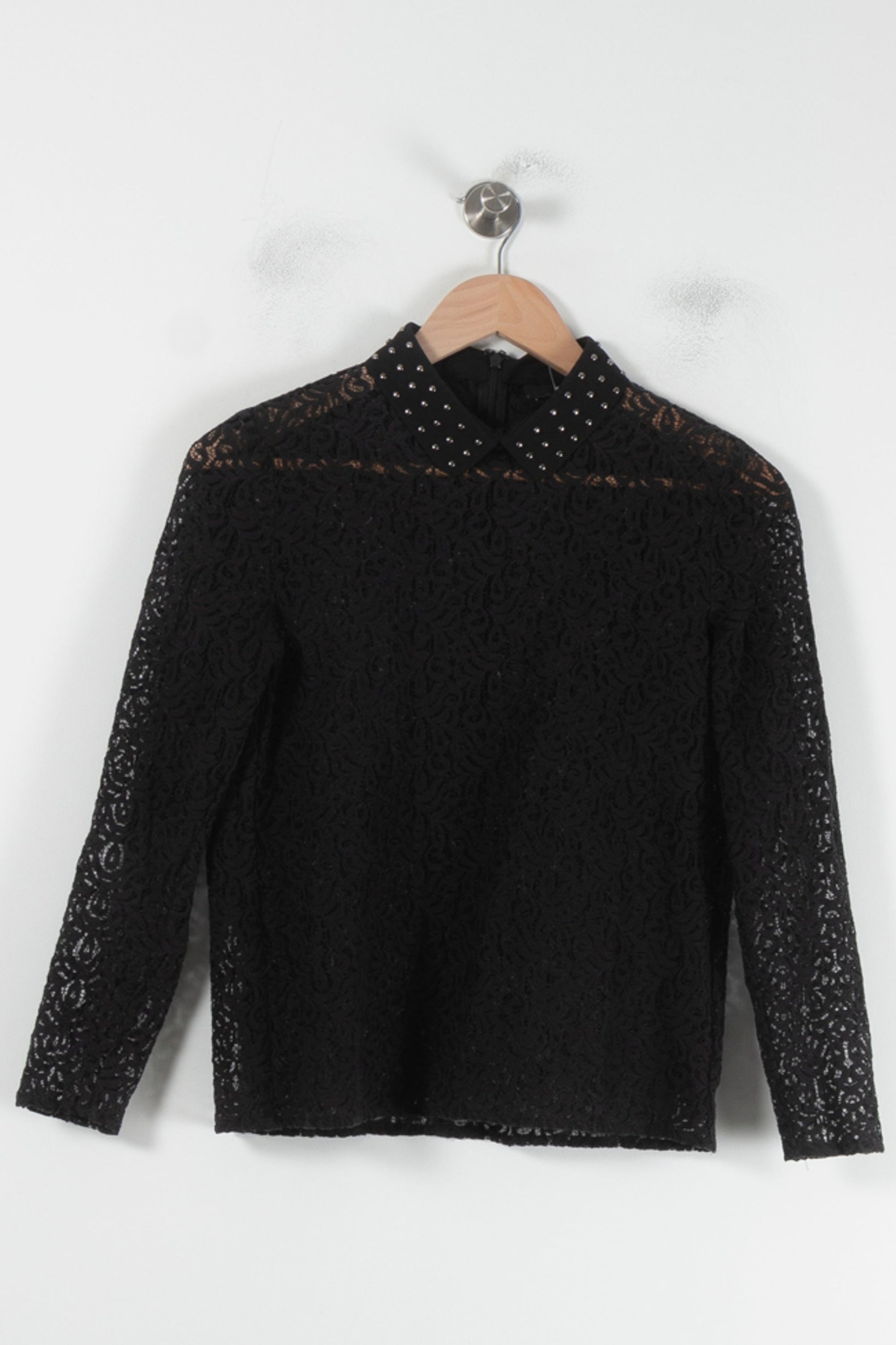 Top noir à manches longues The Kooples, taille XS/34, doté d'un col orné de clous pour une touche rock et élégante. L'association principale de coton et de polyamide est utilisée pour créer une belle structure, une structure dentée et une refonte en polyamide de la ferronnerie pour le modèle original ; un double intérieur en polyester assure confort et opacité. Idéal pour une soirée chic, pleine de sophistication et de caractère.