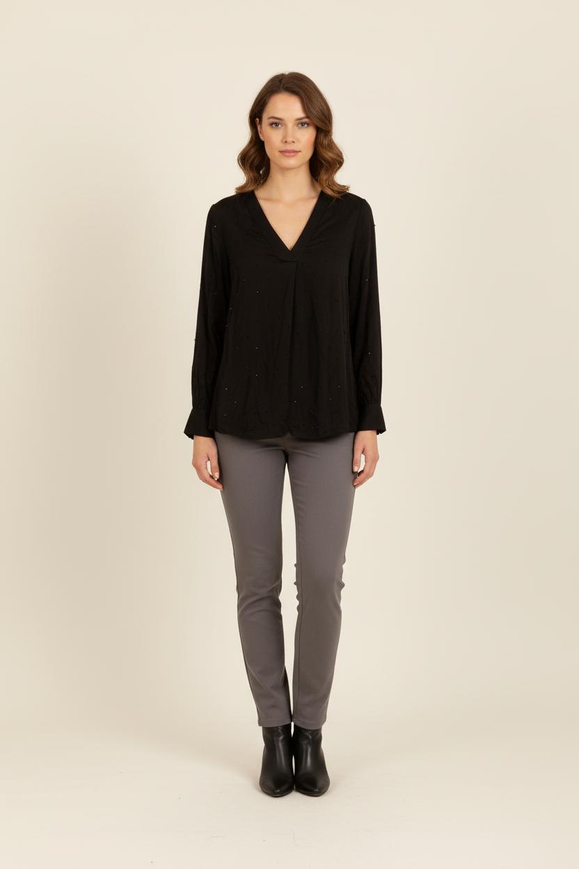 Blouse noire Caroll à manches longues, taille XXL/44, idéale pour une allure élégante et intemporelle. Confectionnée dans une matière souple, cette blouse présente un col en V flatteur et de subtils détails discrets qui lui confèrent une touche de raffinement. Parfaite pour une journée de travail ou une soirée décontractée, elle s’associe aisément à un pantalon habillé ou à une jupe pour un look sophistiqué.