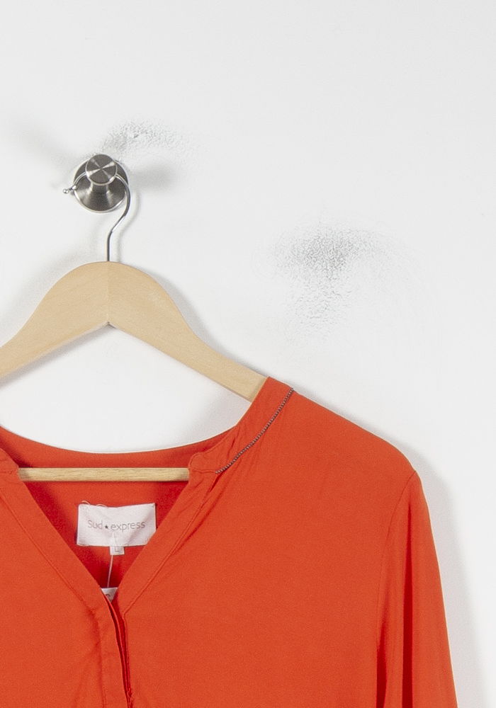 Top orange à manches 3/4 Sud Express, taille L/40, au design fluide et à l’encolure en V. Confectionné en 100% viscose, ce haut se distingue par la douceur et la légèreté de sa matière, ainsi que par ses finitions épurées qui lui confèrent une allure moderne et décontractée. Ce modèle est idéal pour une journée estivale, que ce soit au bureau ou lors d’une sortie décontractée.