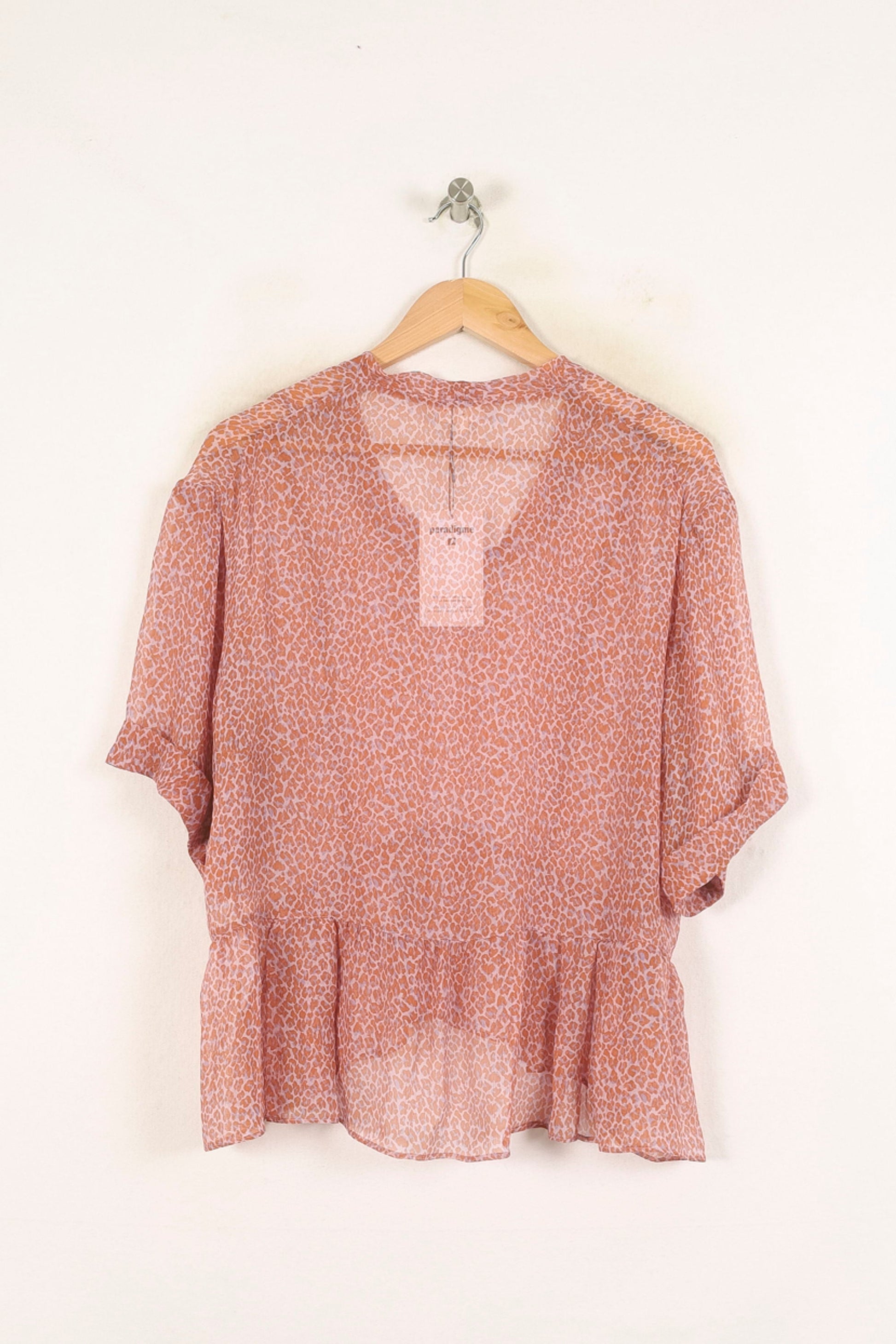 Top fluide à imprimé abstrait rose Pablo, taille L/40, de la marque Pablo. La confection est réalisée dans une matière transparente et limpide, le haut se distingue par sa coupe, les manches courtes et la base sont volantées pour apporter une touche de féminité et de raffinement. Idéal pour une journée de détente à votre bureau ou un dîner en terrasse.