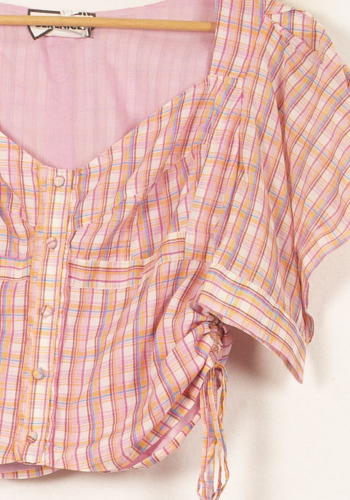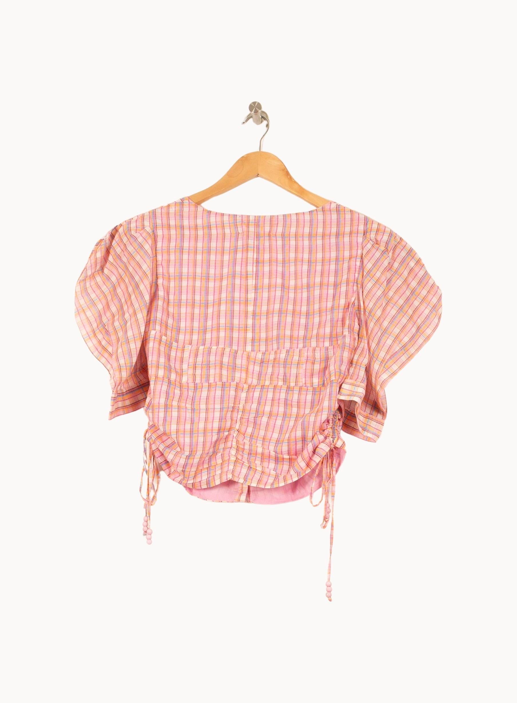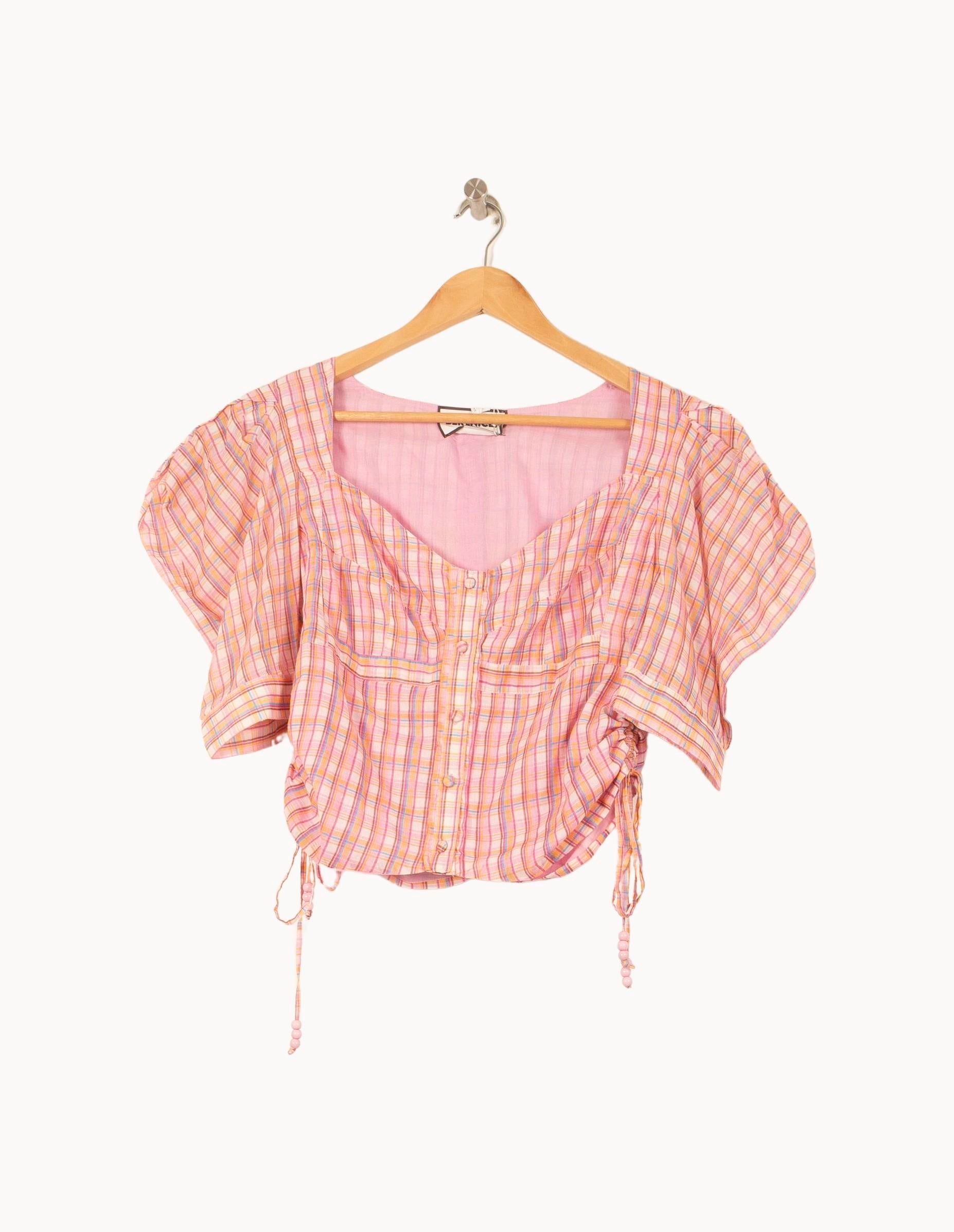 Top à carreaux roses Bérénice, taille S/36, signé par la marque Bérénice, coupé de couleur rose lumineuse. C’est la distinction entre les motifs des tons rose et orange, les manches volumineuses et les liens ajustables sur les côtés, avec une touche de modernité et de féminité. Idéal pour un brunch entre amis et une sortie en journée.
