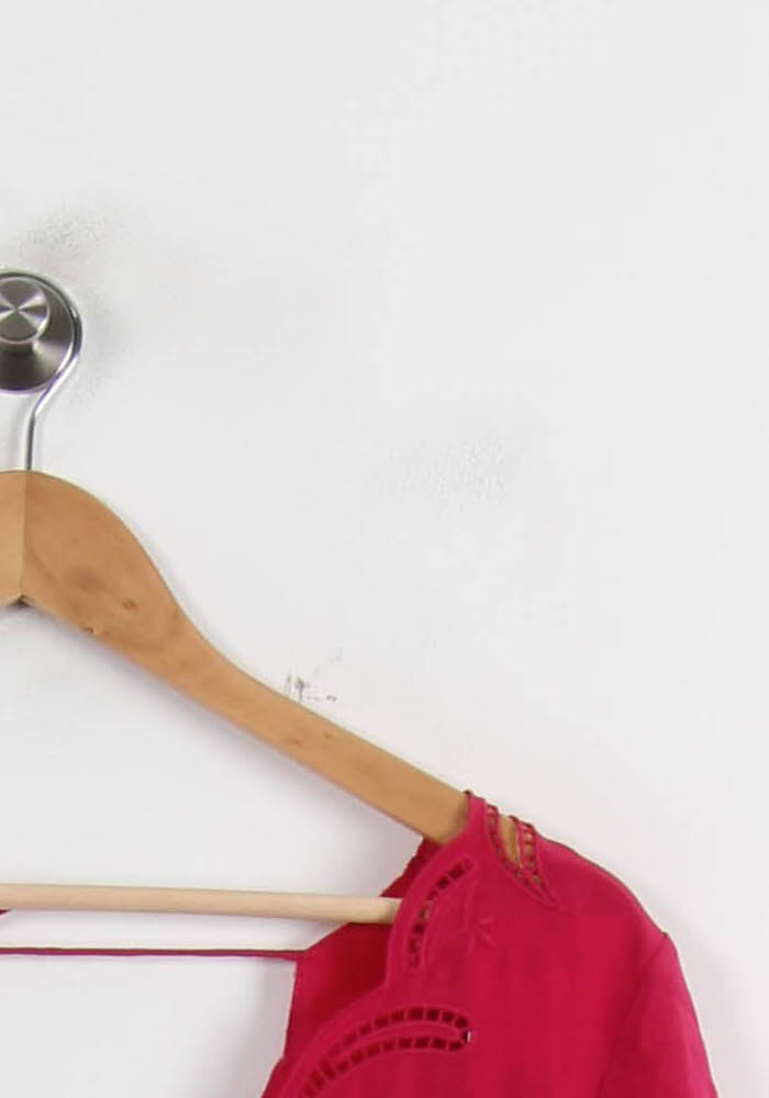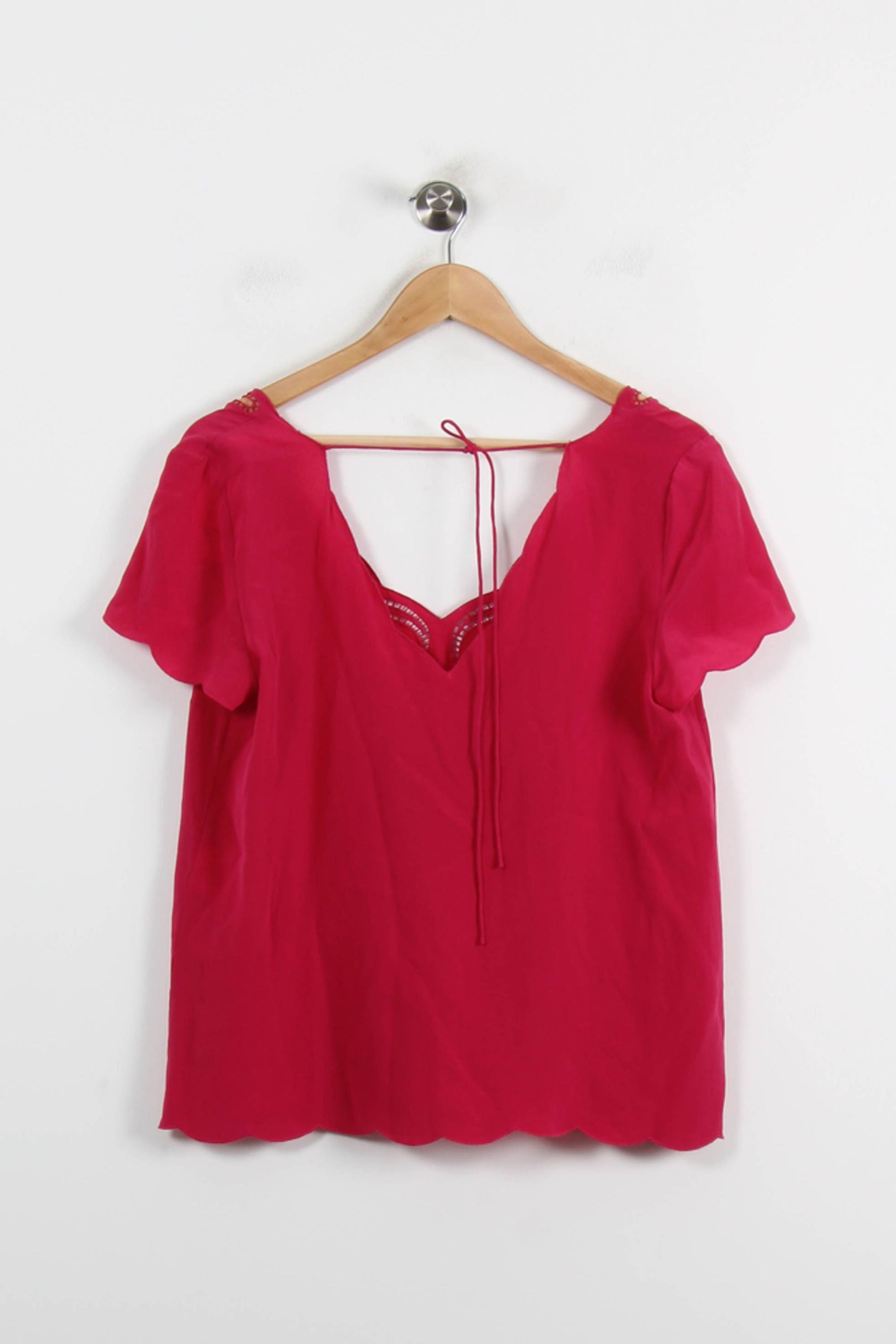 Top Sézane rose, taille L/40, avec ajours et finitions soignées. La différence entre les détails de la broderie au niveau du col et des côtés des vêtements, avec une délicate touche de féminité et de finesse. Surtout pour l'expérience d'un jeune qui cherche sa voie, en prêtant attention au raffinement de sa tenue.