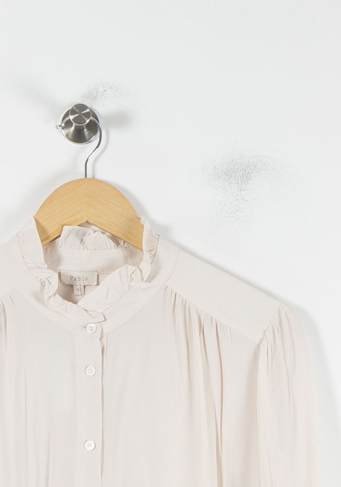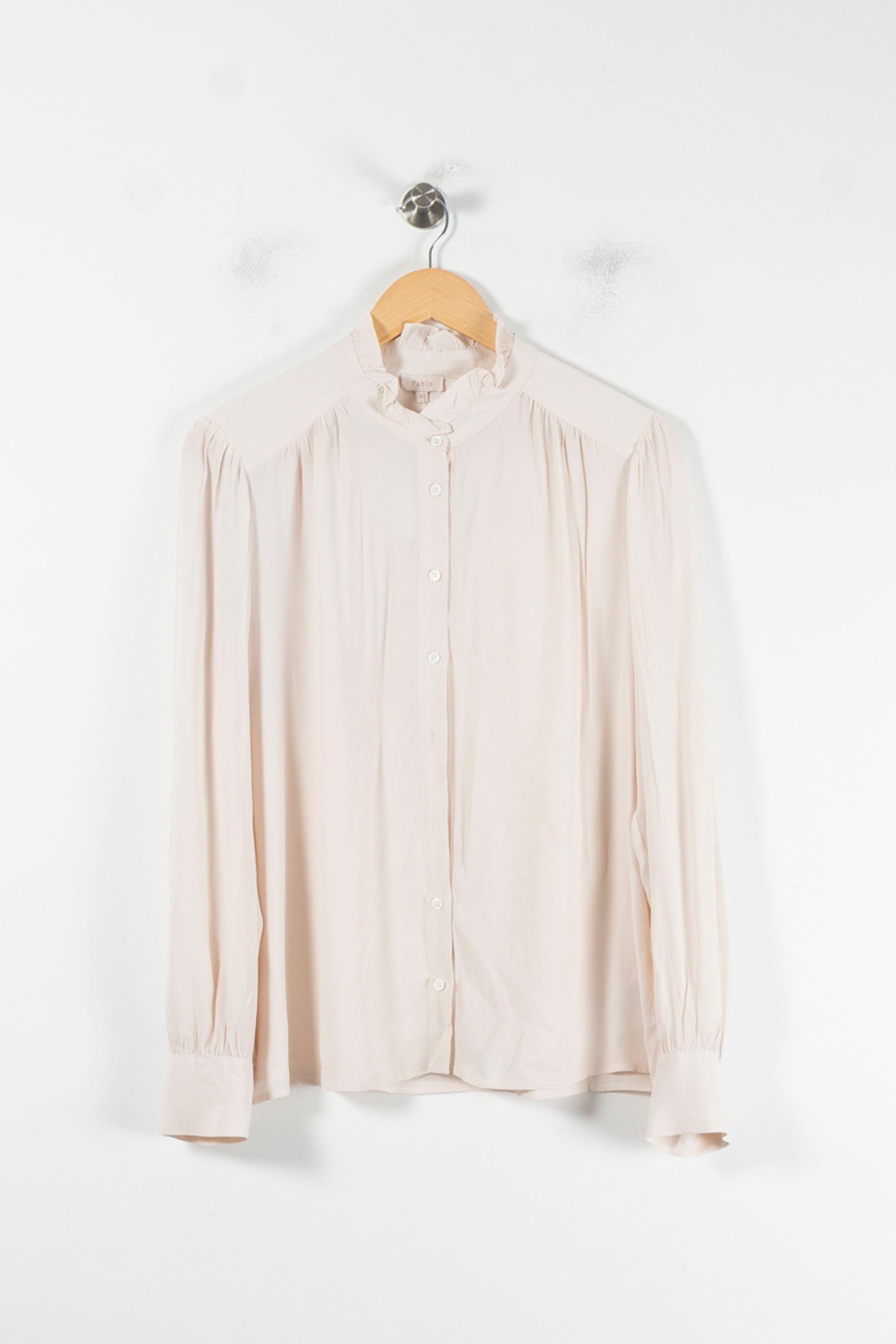 Blouse rose à col volanté Pablo, taille XL/42, élégante et raffinée, idéale pour sublimer les silhouettes. Confectionnée dans un mélange composé à 83 % d'acétate et à 17 % de soie, la blouse présente une texture délicate, un tombé fluide et des détails soignés au niveau des épaules et des poignets boutonnés. Durant votre enfance, vous pourrez également profiter d'une touche féminine dans votre garde-robe.