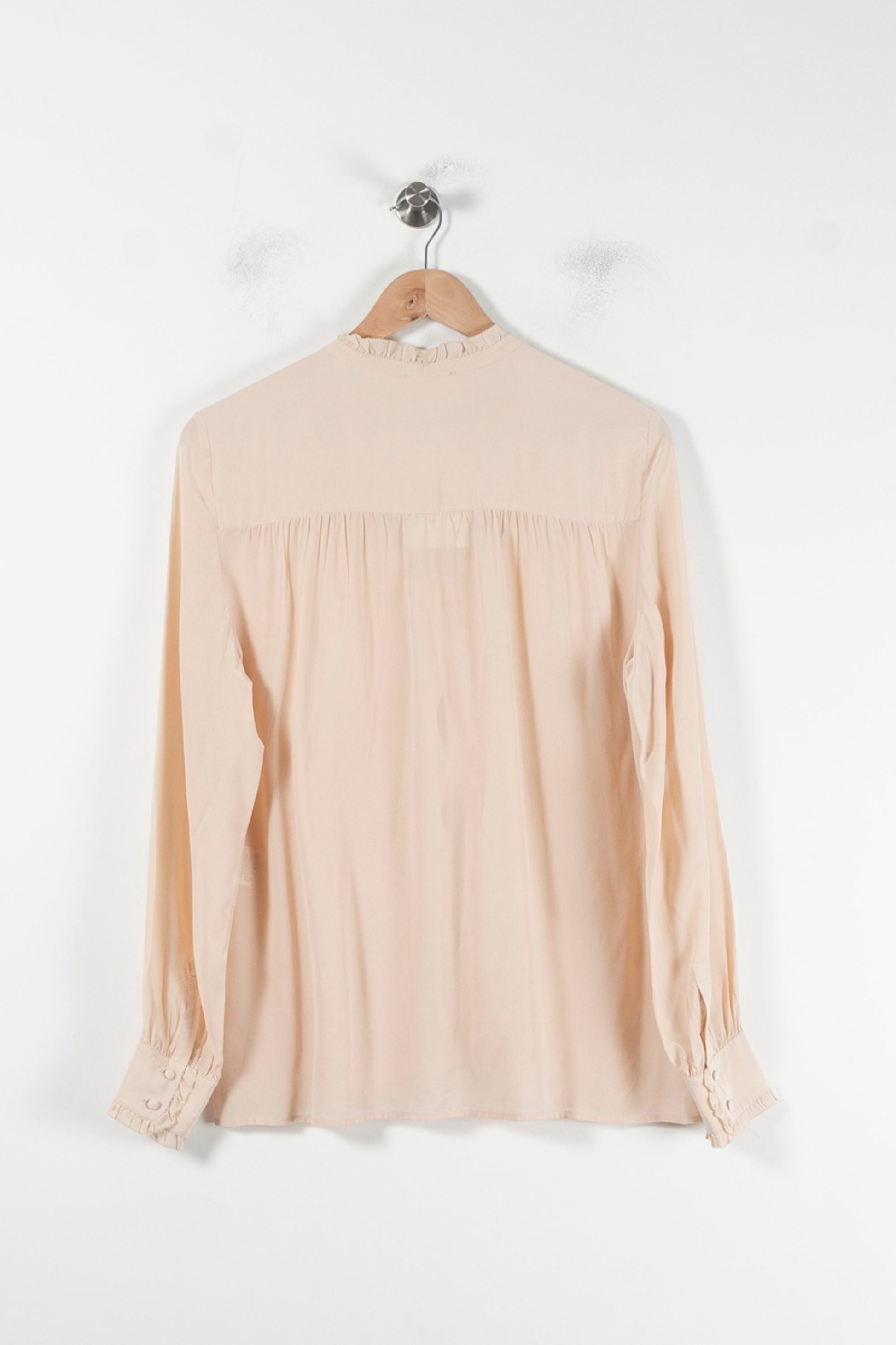 Blouse rose Sézane, taille XL/42, avec manches longues, col roulé à volants et fermeture boutonnée. Confectionnée en soie 100% naturelle, cette pièce met en valeur la finesse de la matière et la délicatesse des détails, des volants au grain, tout en y ajoutant une touche d'élégance. Idéal pour un rendez-vous professionnel avec un look chic, idéal pour une tenue raffinée.