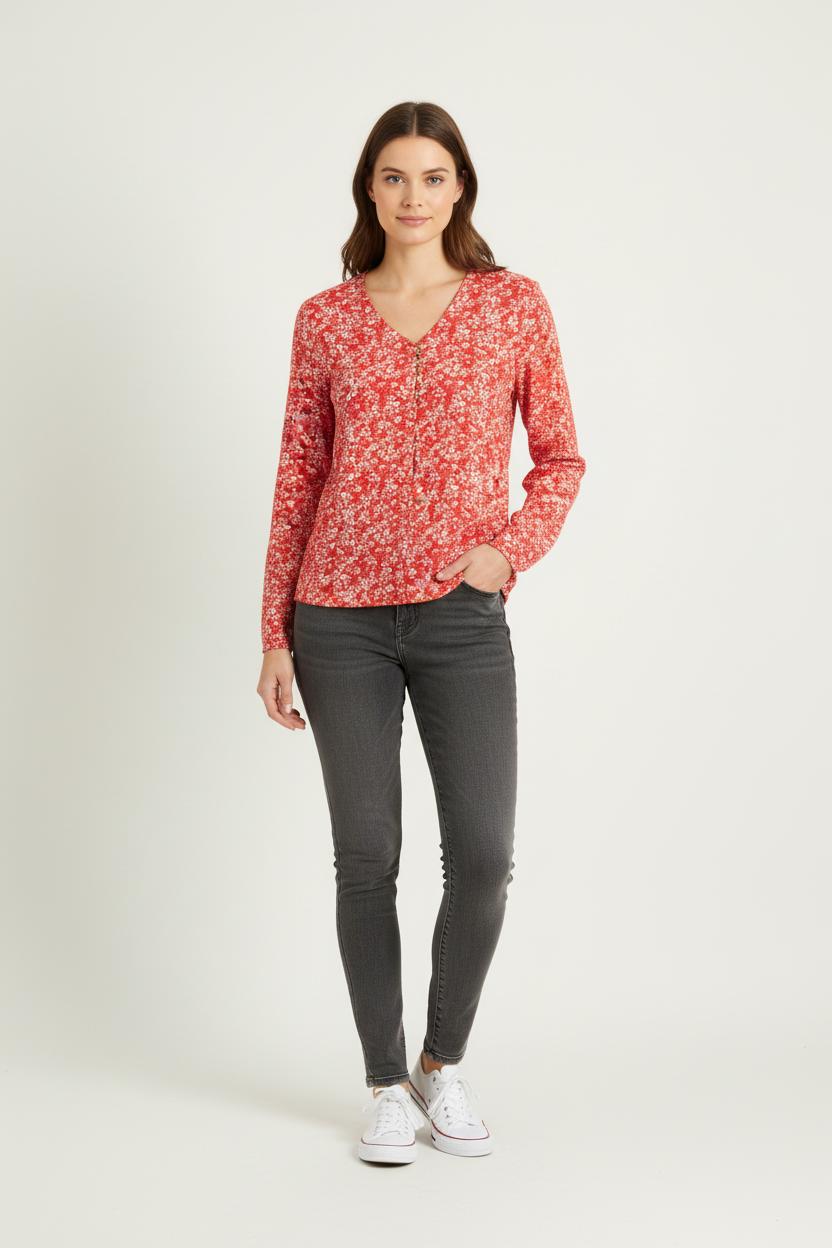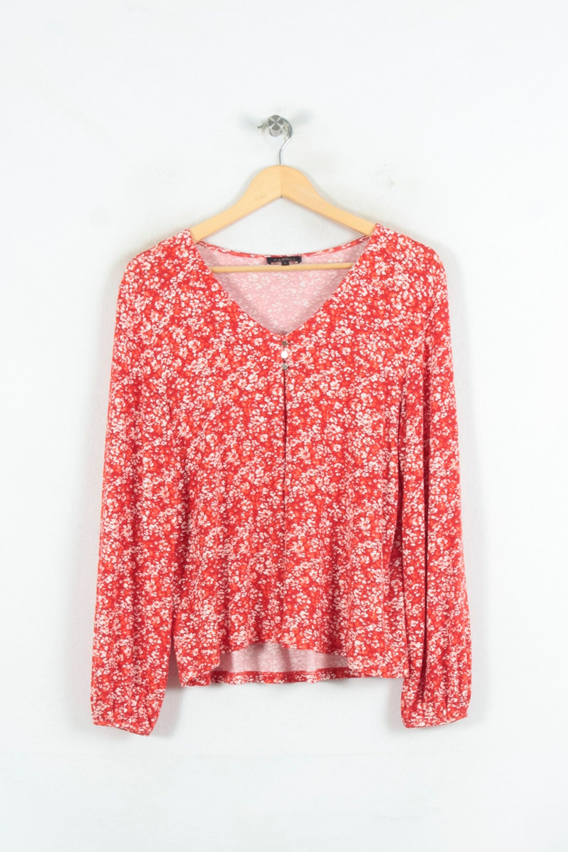 Blouse fleur rouge Caroll, taille S/36 : un haut élégant avec des manches longues, à l'encolure et en V et orné de petits motifs floraux blancs, issue de la marque Caroll. La matière et le fluide assurent un port confortable, et le motif de couleur rouge dynamise la silhouette et ajoute une touche de féminité et d'originalité. Idéal pour qu'un jeune vous accompagne lors de votre voyage, à associer avec un pantalon décontracté.