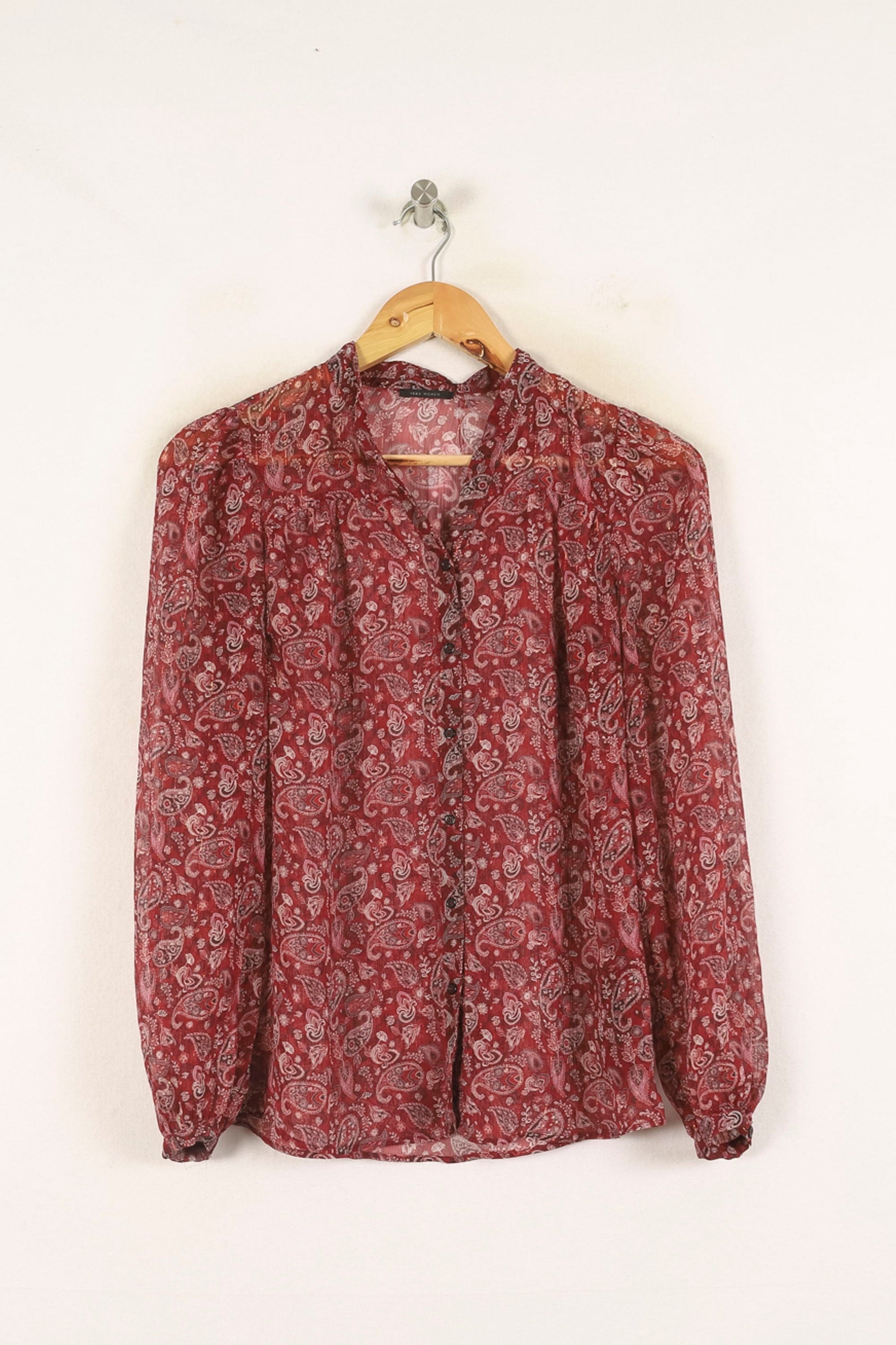 Blouse rouge à motifs cachemire IKKS, taille XS/34, idéale pour un look féminin et élégant. La confiserie est faite à partir d'une matière semi-transparente, qui se distingue par les détails des délicatesses, utilisant les parties auxiliaires françaises et les bouquets à long terme des manches, offrant une fluidité et un raffinement tombés. Pour une journée de travail avec un pantalon et une sorte de contrat avec un jean.