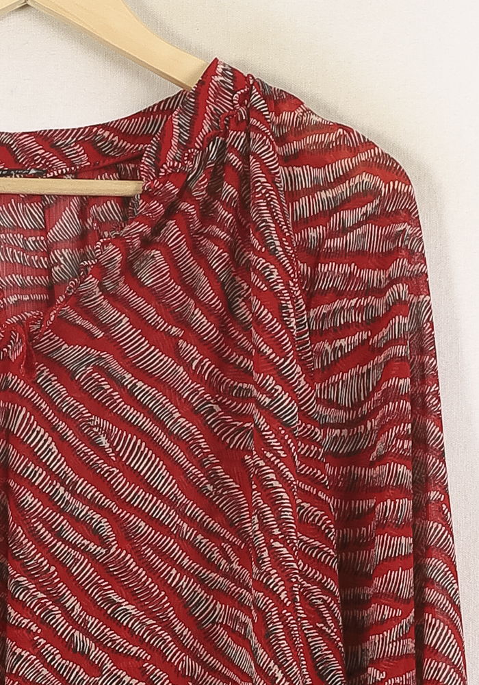 Top femme One Step, taille XXL/44, imprimé rouge à motifs graphiques. La confiserie est une matière fluide, le modèle se distingue par la longueur du vêtement, les longueurs importantes étant utilisées pour les élastiques et le design est particulièrement confortable et élégant. Parfait pour une journée au bureau ou un déjeuner entre amis.