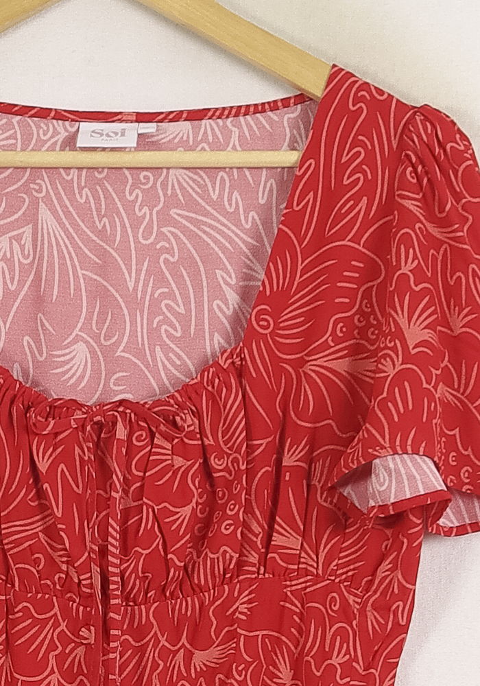 Blouse rouge à motifs floraux - Soi Paris, taille L/40 : ce top élégant de la marque Soi Paris séduit par sa coupe féminine et son imprimé dynamique. Confectionné dans une matière légère et fluide, il se distingue par ses manches courtes légèrement transparentes, son col rond froncé et son motif floral blanc qui apporte une touche raffinée et contemporaine. Idéal pour une sortie estivale ou un déjeuner entre amis, ce top promet confort et style en toutes circonstances.