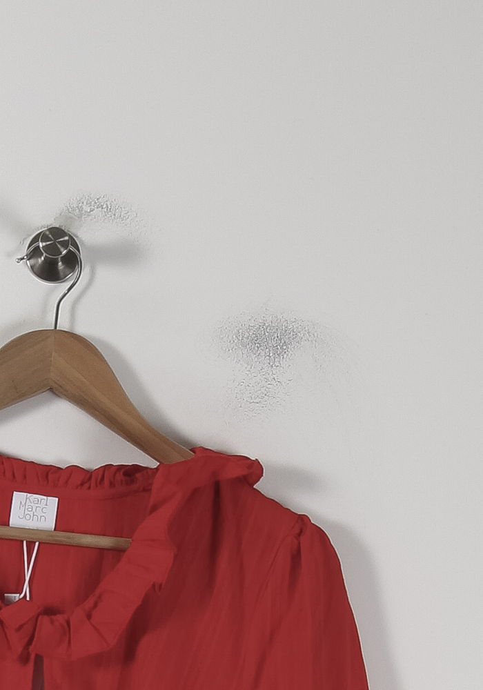 Top rouge Karl Marc John, taille M/38, en trois-quartz et col à volants. Confectionné en 100% coton, il est réalisé avec une matière de haute qualité et une finition naturelle, rehaussée d'une touche de couleur, pour une note de féminité et de raffinement. Une journée idéale pour passer la soirée au bureau et adopter un look élégant et professionnel.