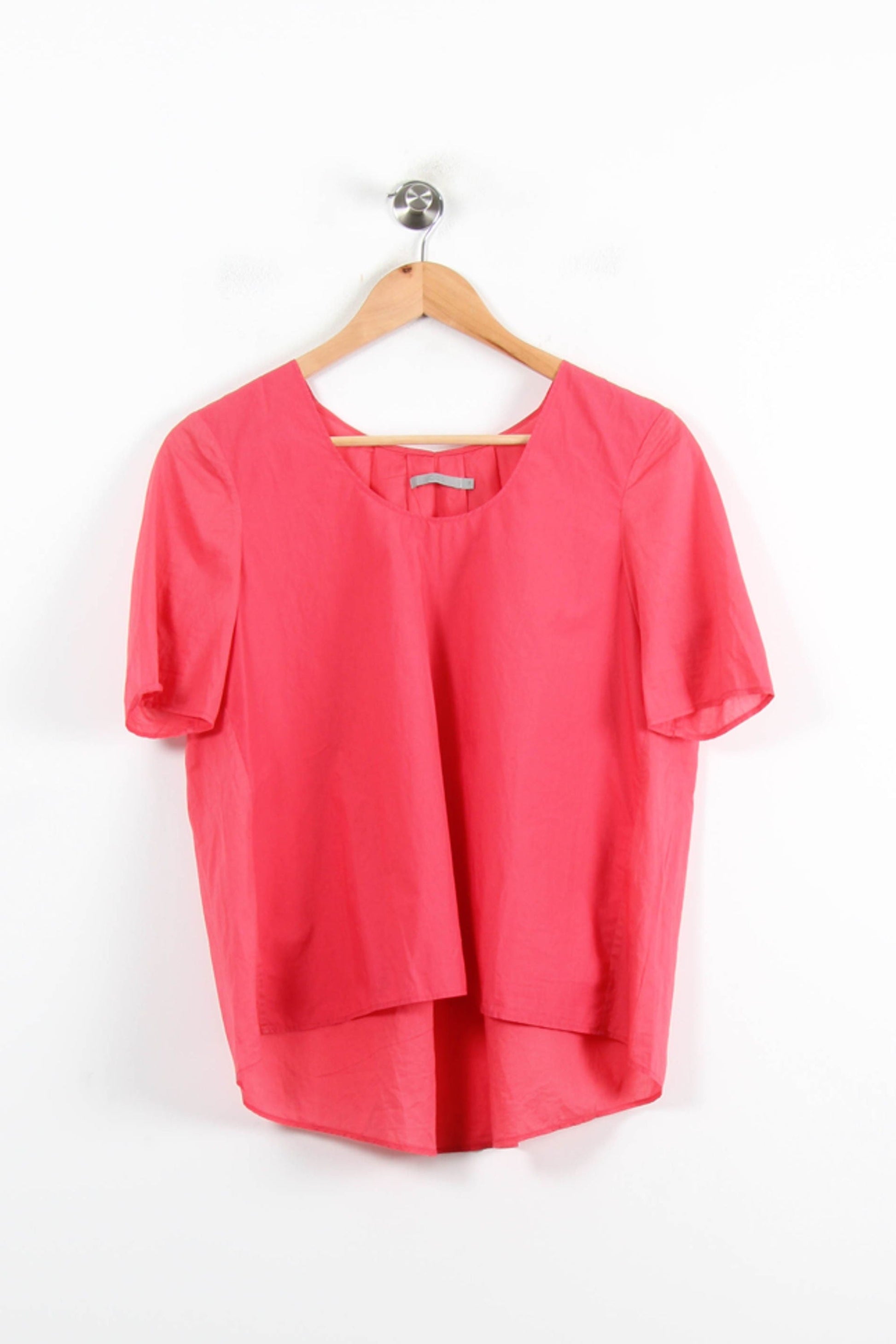 Top rouge COS, taille S/36, chemise à manches courtes au design minimaliste et élégant. La finition du tissu, adaptée à l'aspect du vêtement, avec sa forme et sa taille distinctives ainsi que son asymétrie, lui confère une allure moderne et sophistiquée. Idéal pour une journée de voyage ou pour un look jeune et chic en ville, avec une allure impeccable et une touche de raffinement dans votre tenue.