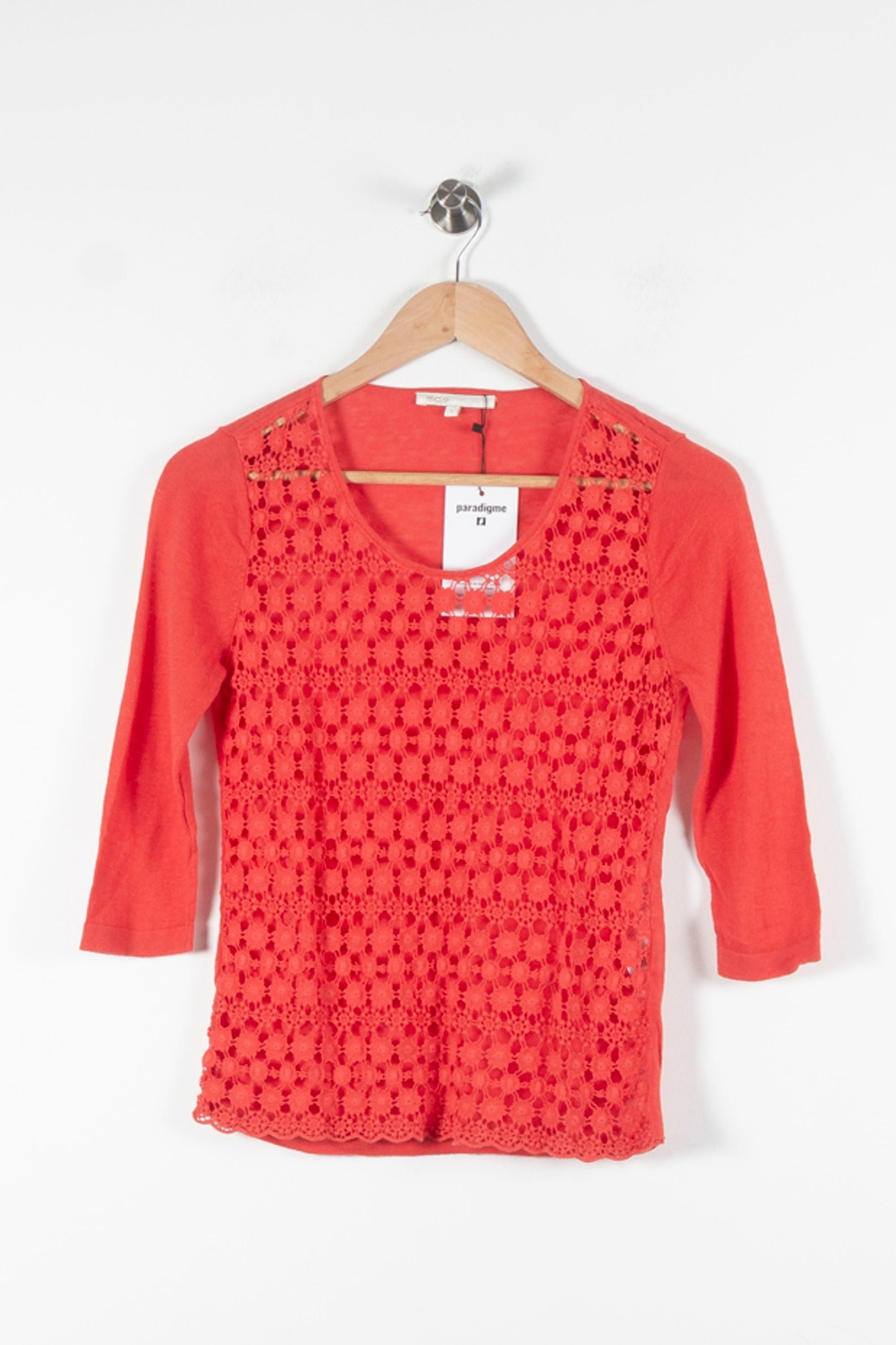 Top rouge Maje et taille S/36, en trois quartz et ronds colorés, motif orné d'un délicat ajouré sur le devant. Le tissu est principalement composé de 55 % de lin et de 45 % de coton, avec une utilisation secondaire de 100 % de coton, ce qui lui confère une texture raffinée et une élégante transparence qui caractérisent la pièce. Idéal pour composer une tenue sublime à porter en journée et apporter une touche de sophistication à votre brunch.