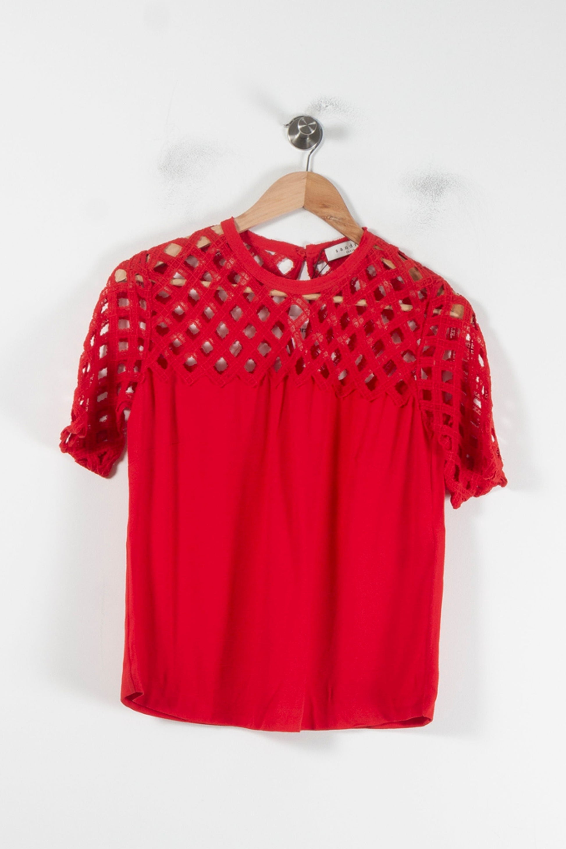 Top et dentelle rouge Sandro, taille S/36 – Élégant haut femme de la marque Sandro, avec détails épaule et manches. Confectionné en 60 % viscose et 40 % coton pour le corps, et en 100 % coton pour les empiècements, ce modèle se distingue par ses motifs transparents qui lui confèrent une allure sophistiquée et moderne. Idéal pour un look décontracté et pour ajouter une touche chic à votre tenue du jour.