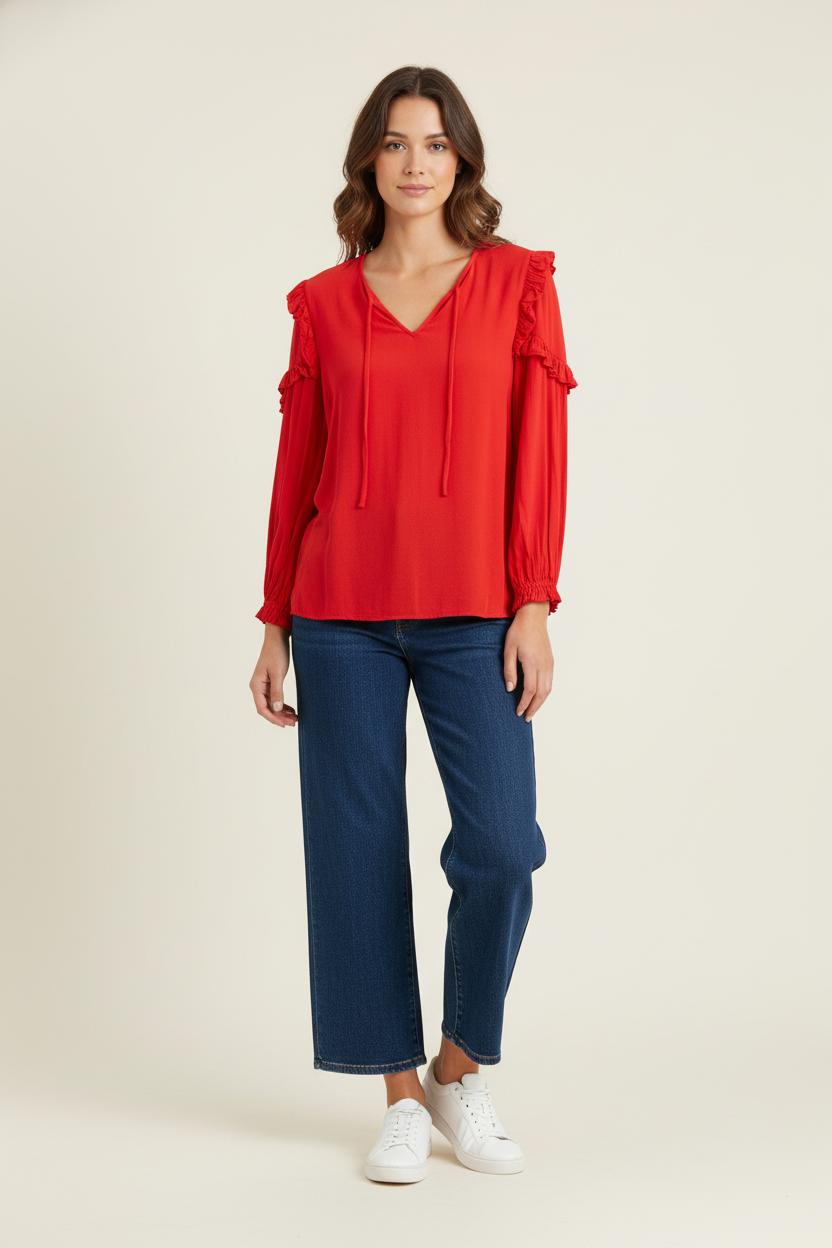Top rouge à manches longues à volants, Maje, taille S/36. Conçue en viscose 100% naturelle, avec le plus grand soin apporté aux détails et un toucher délicat, la confection de ces vêtements révèle un raffinement naturel, pour une allure d'élégance féminine. Idéal pour une journée au bureau ou dans un environnement élégant.