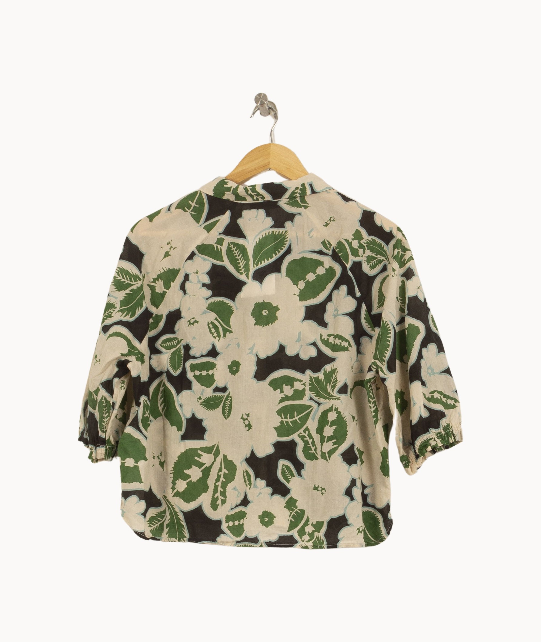 Top Caroll multicolore à imprimé floral, taille M/38, idéal pour apporter une touche de fraîcheur et d’élégance à votre garde-robe. Confectionné dans une matière fluide, ce top se distingue par son motif floral vert et blanc sur fond noir, son col rond avec petit nœud et ses manches ajustées aux poignets, offrant un style unique et raffiné. Parfait pour une journée de travail au bureau ou un déjeuner en ville.