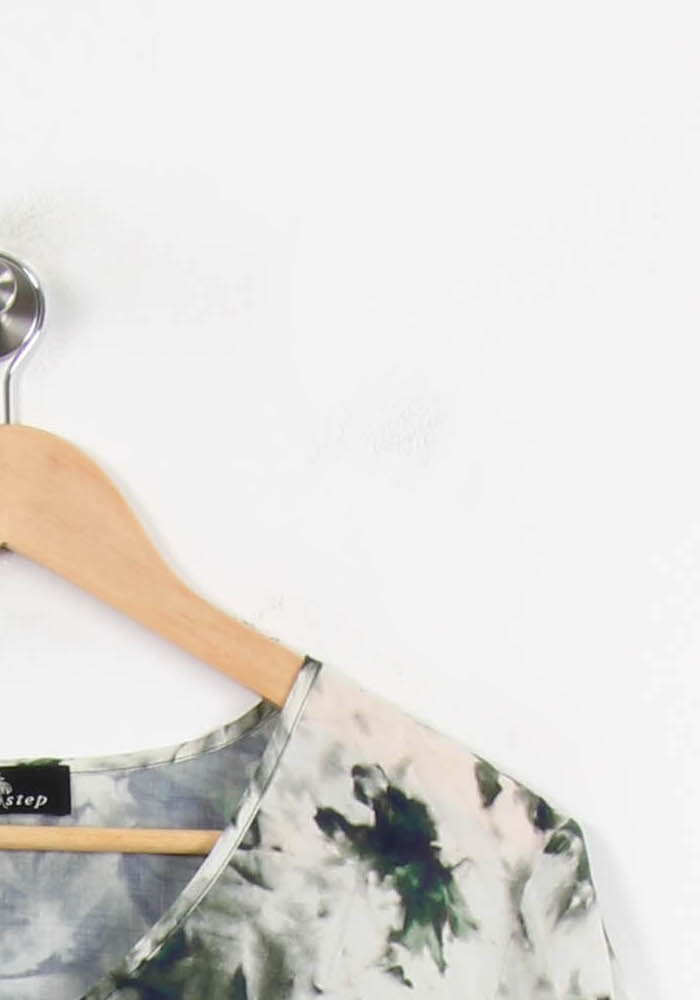 Top vert One Step taille M/38, manches courtes, motif tie-dye, deux poches poitrine zippées. La fluidité et la qualité du matériau sont excellentes grâce à l'impression originale des tonnes et des tonnes de dents, l'âme des fermetures éclair qui apportent une touche moderne et sophistiquée. Idéal pour une journée de travail contractuel et un processus de tri pour un aspect et un perfectionnement.