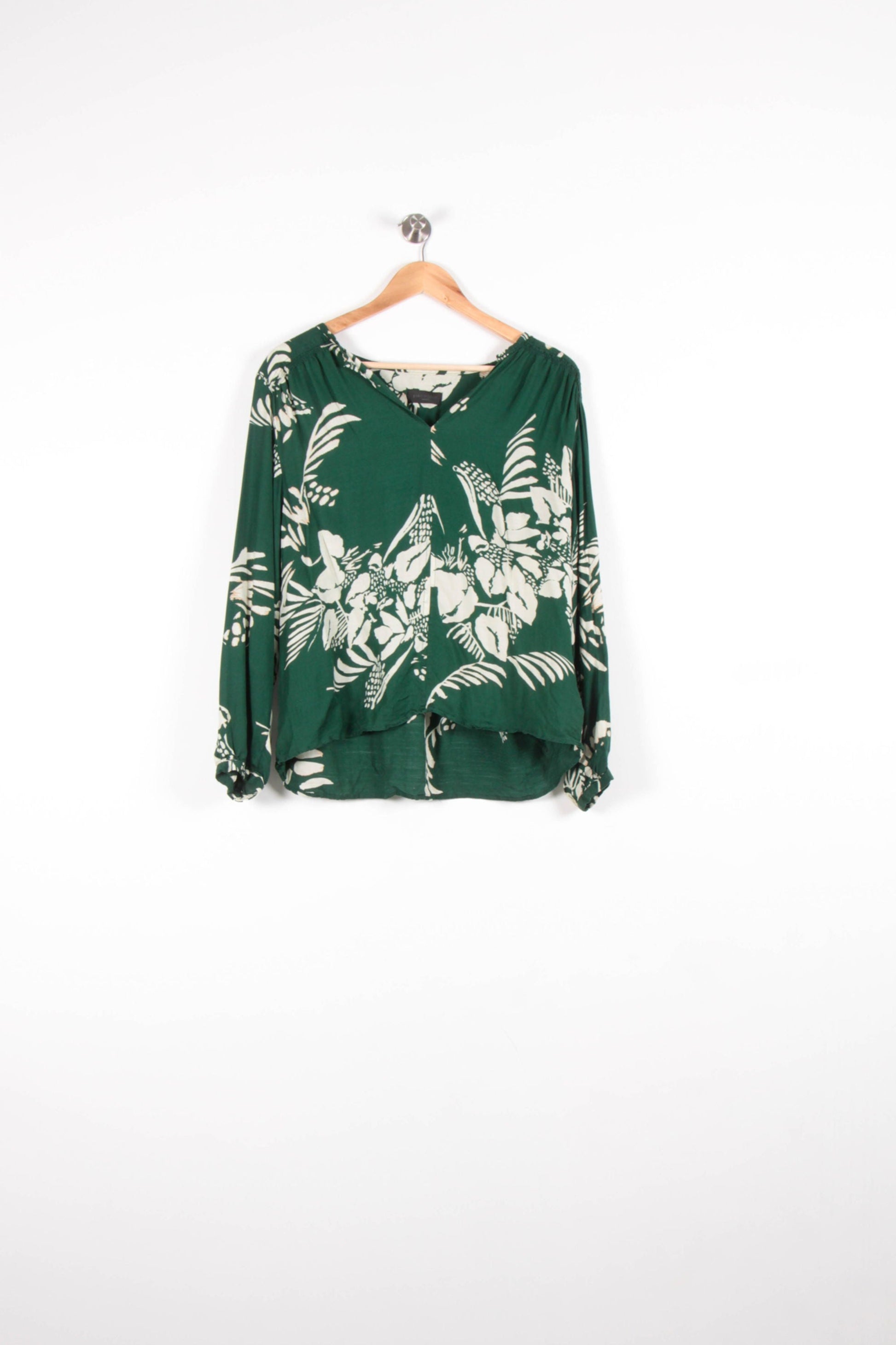 Top imprimé floral vert IKKS, taille M/38, la marque IKKS : très élégant et moderne pour sublimer les tenues renard. Une confiserie à la matière fluide, ornée d'un motif floral blanc contrastant, apportant une touche d'originalité et de fraîcheur, avec une longueur de coupe généreuse et un entretien longue durée pour un confort optimal. Idéal pour une journée de travail ou un contrat de tri, alliant au mieux raffinement et pratique.
