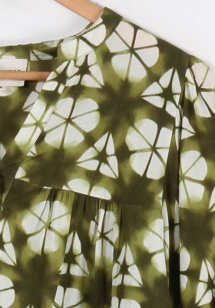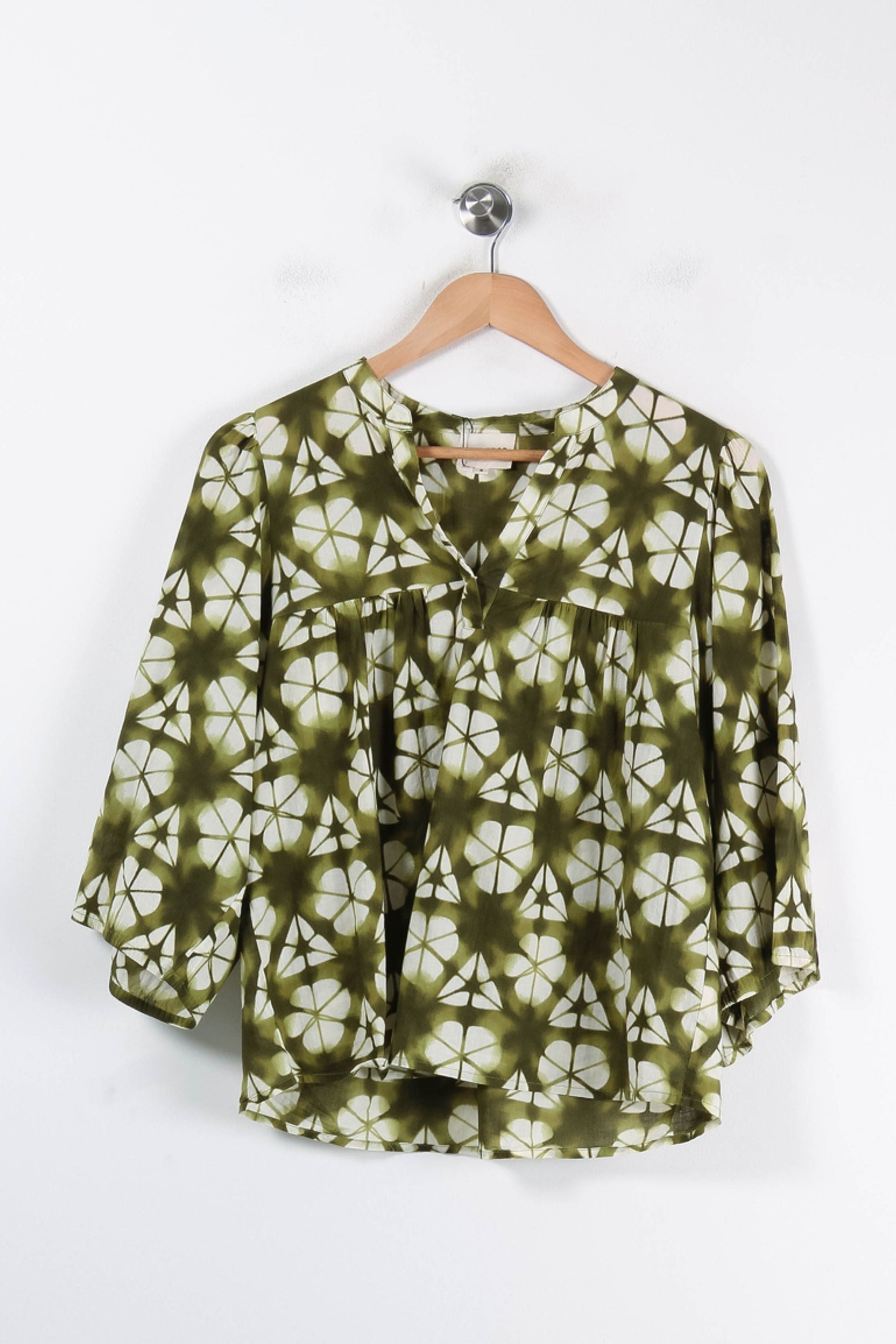 Top ample Garance Paris vert, motif graphique, taille S/36. Confectionnée en 100% coton, elle reprend le design géométrique original et est réalisée en trois quarts, avec une allure moderne et un style unique. Idéal pour une journée de contrat ou une journée de mariage.
