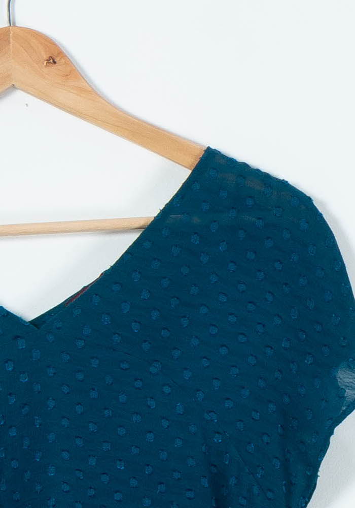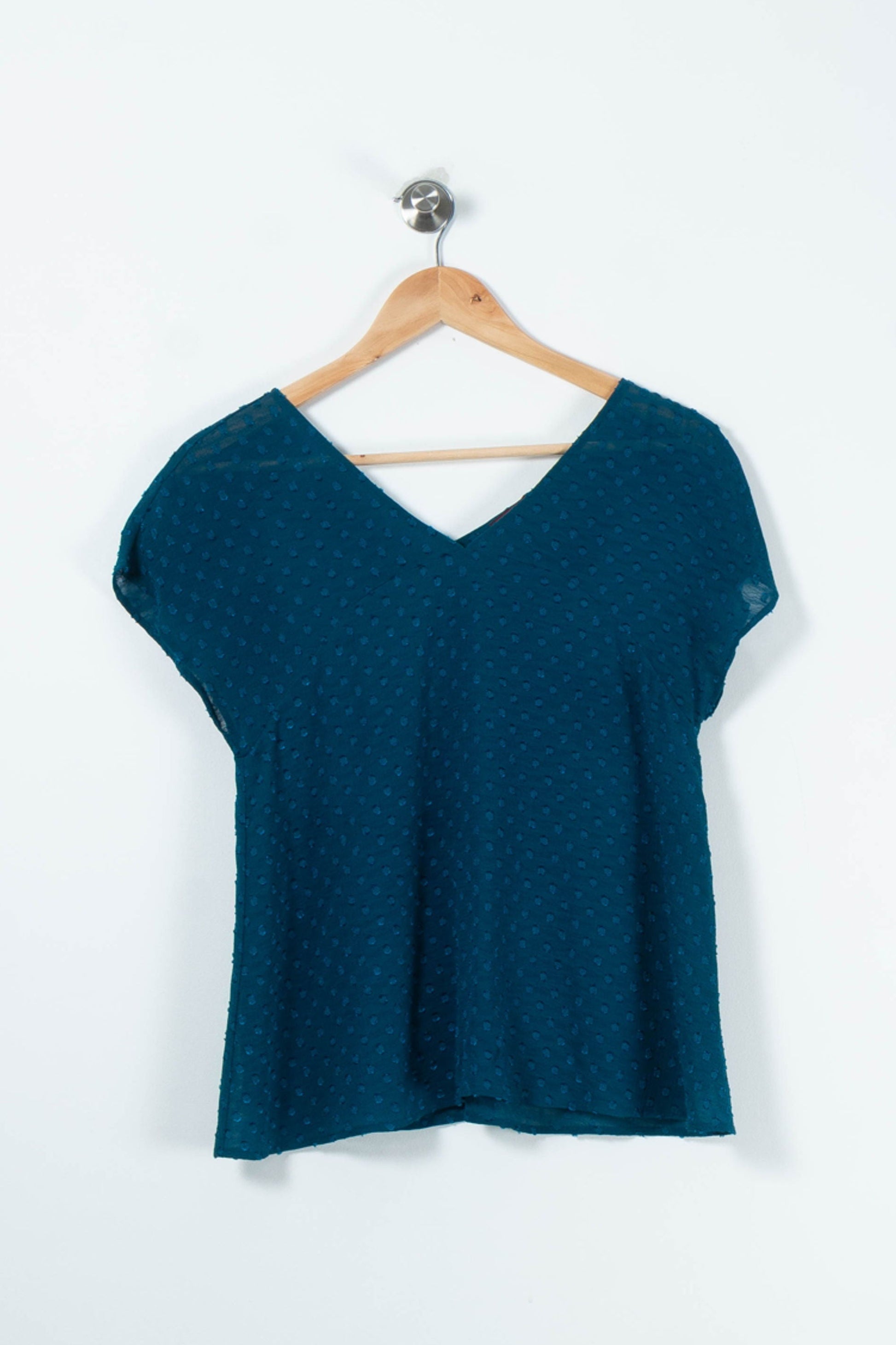 Top vert en tissu texturé Comptoir des Cotonniers, taille S/36. Composé à 100% de polyester doublé et de viscose, ce tissu se distingue par sa matière et le motif de ses textures, ce qui lui confère un aspect sophistiqué et moderne. Idéal pour un voyage pendant le trajet ou une mission pendant le contrat.