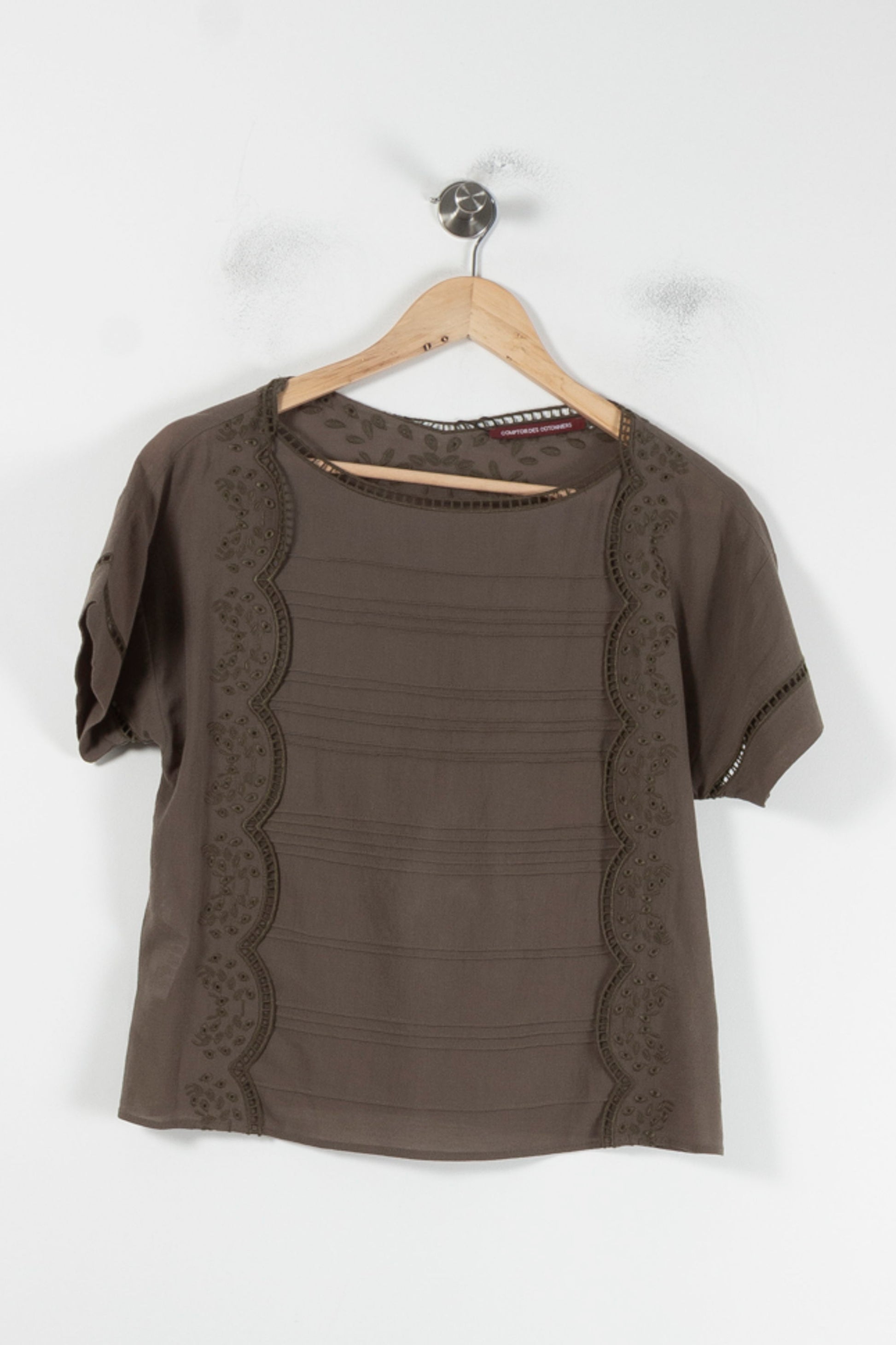 Top vert Comptoir des Cotonniers, taille S/36, à manches courtes et col rond, orné de broderies délicates sur le devant. Confectionné en 100% coton, ce modèle se distingue par ses finitions brodées en relief, ses bords festonnés et ses élégants détails ajourés au niveau des manches. Parfait pour une journée de travail estivale ou un déjeuner entre amis, il se marie aisément avec un pantalon clair ou une jupe fluide.