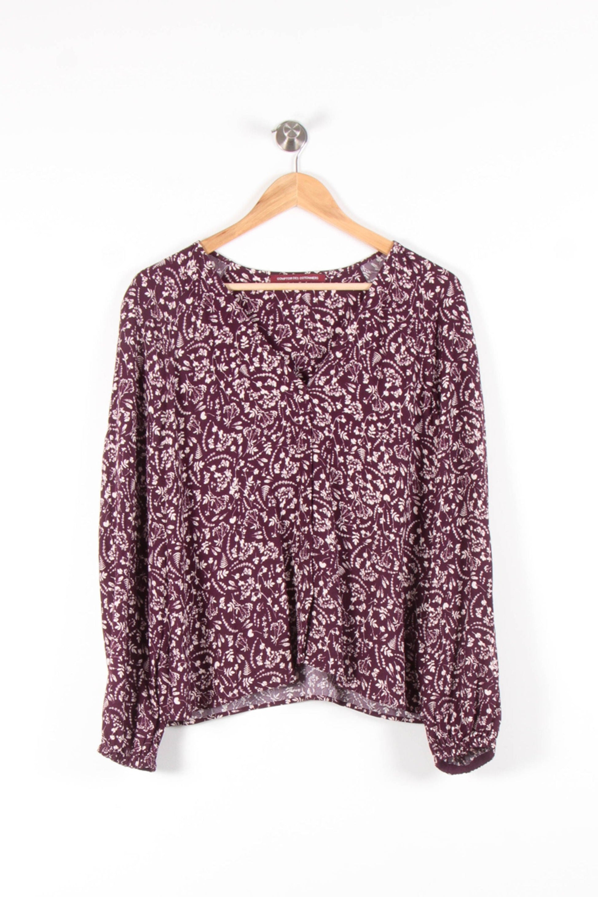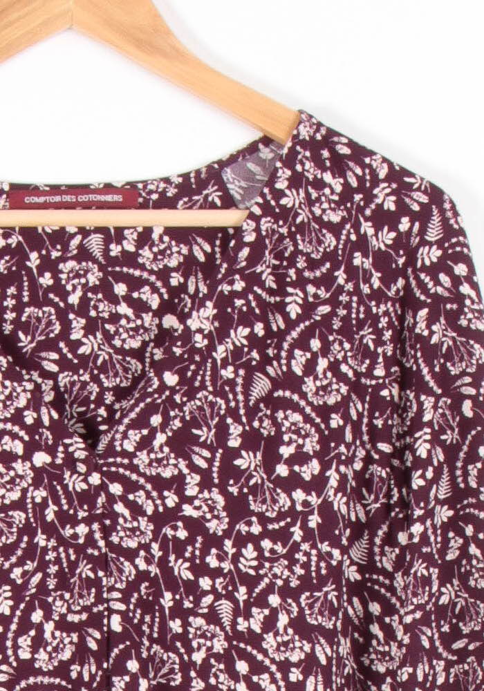 Blouse imprimé violette Comptoir des Cotonniers, taille XXL/44 – un haut élégant avec imprimé floral aux couleurs profondes. Confectionnée dans une matière fluide et avec une finition soignée, cette blouse se distingue par les détails de ses devants et la longueur de ses manches longues, avec une touche de raffinement original. Idéal pour une journée au bureau ou un dîner entre collègues, avec la même facilité d'utilisation qu'un pantalon.
