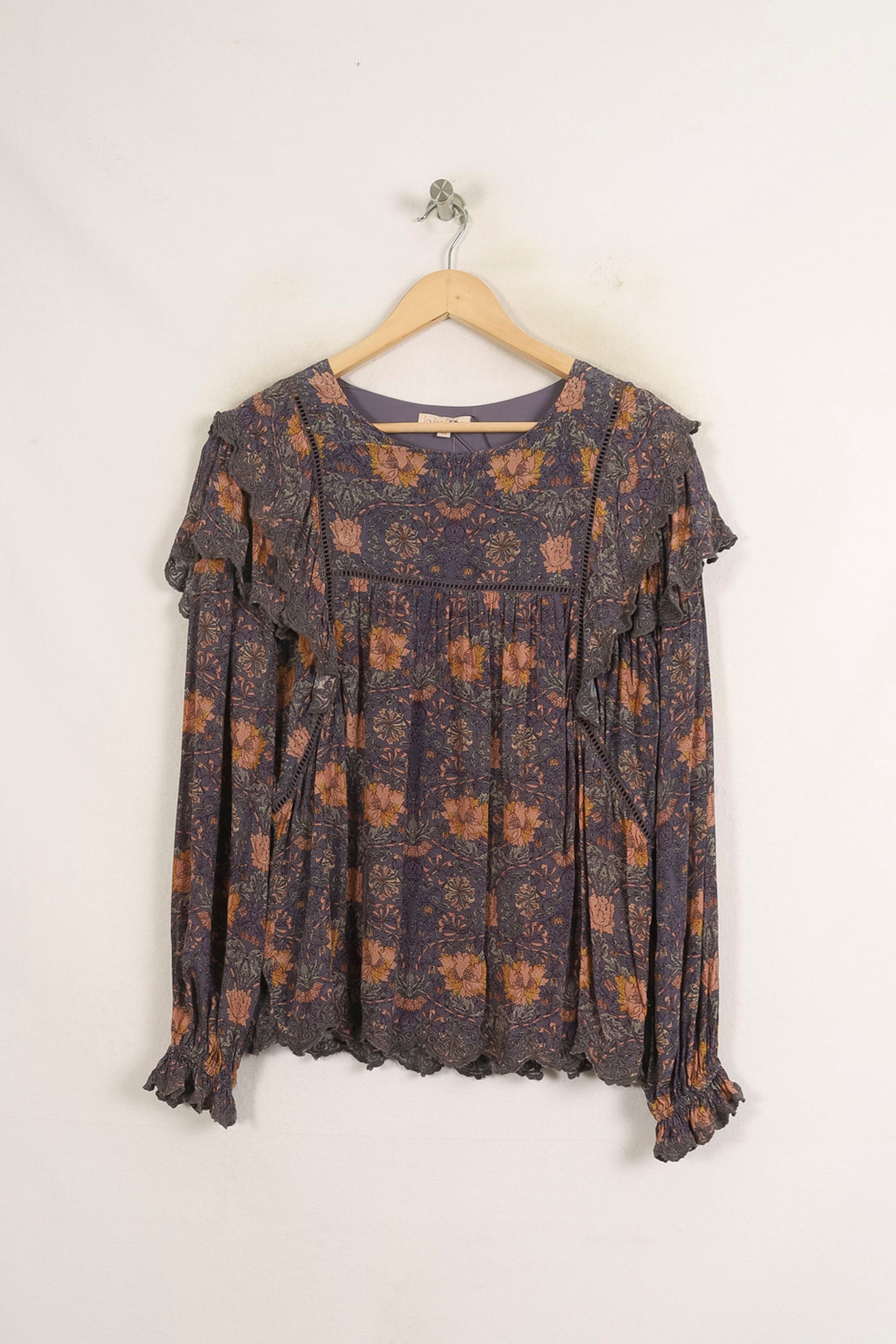 Blouse à motifs floraux violets Louise Misha, taille S/36, élégante et raffinée, idéale pour une belle collection de hauts. Confectionnée dans une matière fluide, cette blouse se distingue par ses délicates finitions et les détails de ses broderies qui la rendent unique et féminine au sein de l'ensemble. Idéal pour une journée au bureau ou un déjeuner en ville, avec une allure bohème chic et tout en simplicité.