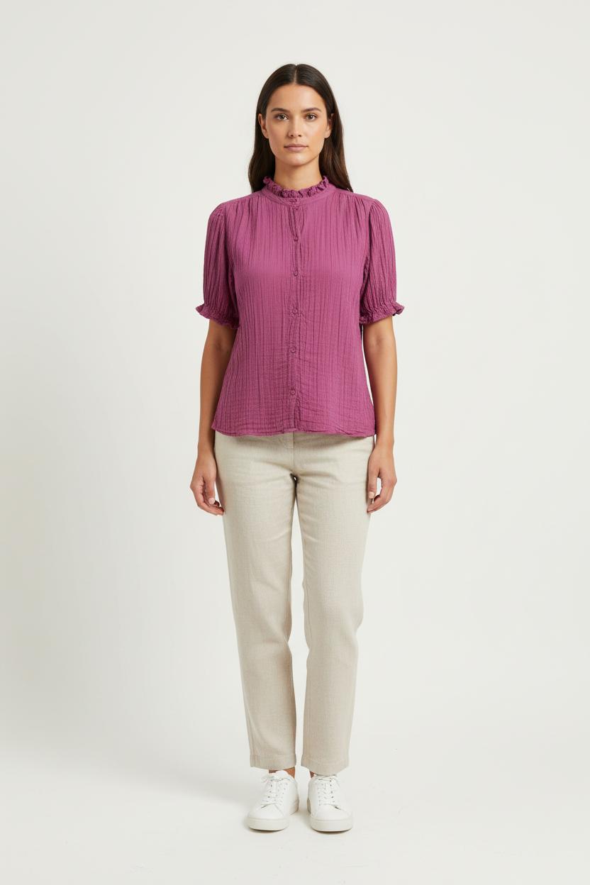 Blouse à col volanté et coton gaufré violet La Petite Etoile, taille S/36, élégante et féminine. Confectionnée dans une matière et une texture particulières, cette blouse se distingue par ses manches à volants et ses boutons assortis, apportant une touche de raffinement et un charme unique à l'ensemble. Idéal pour une terrasse décontractée ou une journée de voyage, à associer à un pantalon coloré et à une allure jeune et fluide.