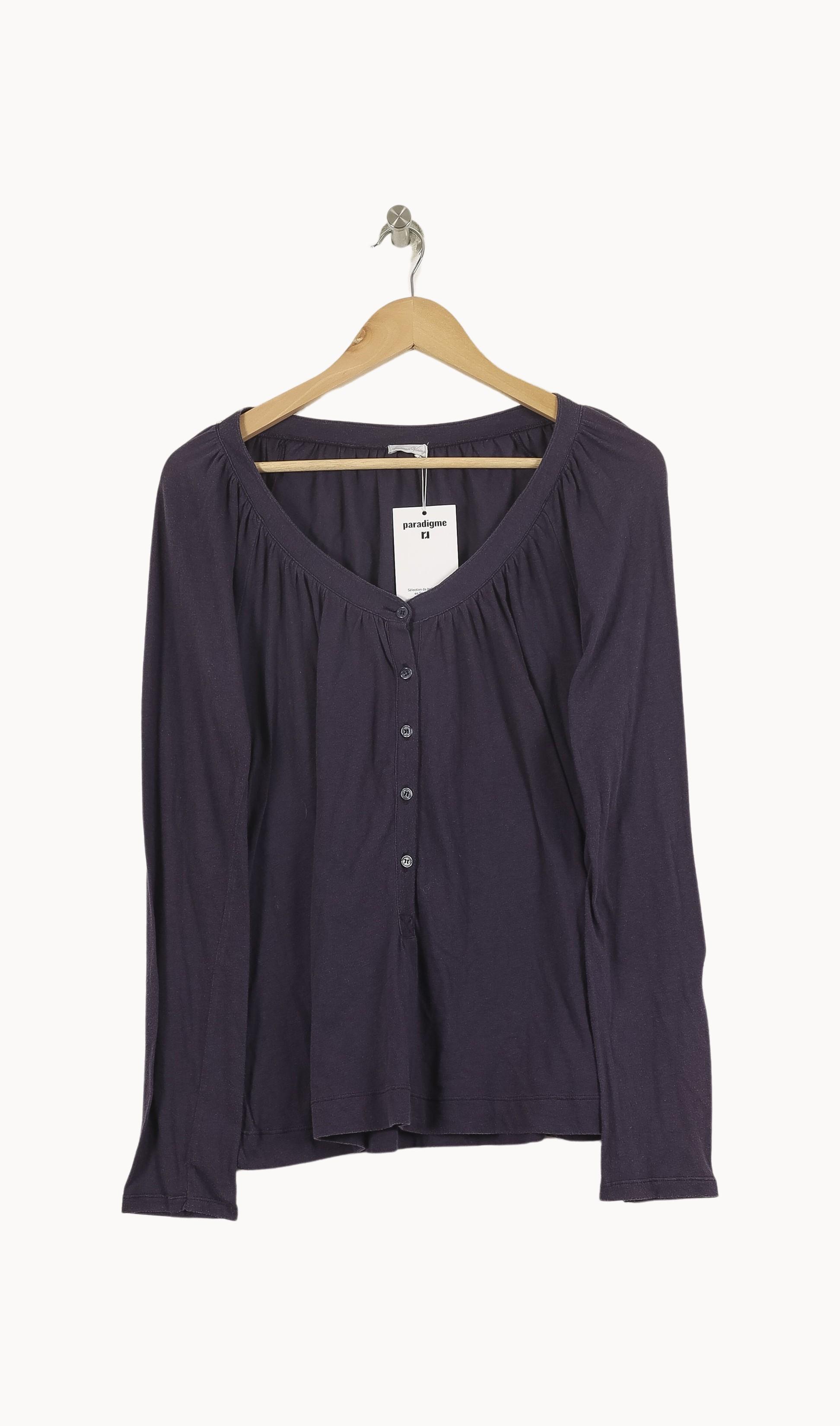 Top violet à manches longues American Vintage, taille unique, au style épuré et col et V boutonné. La confiserie est réalisée avec une matière et une finition soignées, avec une présentation soignée des délices devant le col et une patte de boutonnage centrale avec une touche de raffinement. Idéal pour une journée de travail sur un chantier lors de votre après-midi en ville.