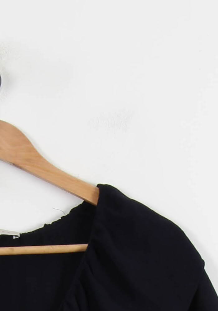 Top Sandro bleu à volants, taille S/36, signé de la marque Sandro. La différence entre la surface et le fluide, avec une grande vallée et un haut élégamment de l'encolure et des manches, donne une touche raffinée et une pièce unique. Idéal pour un look élégant et un style chic décontracté en ville, avec un pantalon tailleur et une allure très élégante.