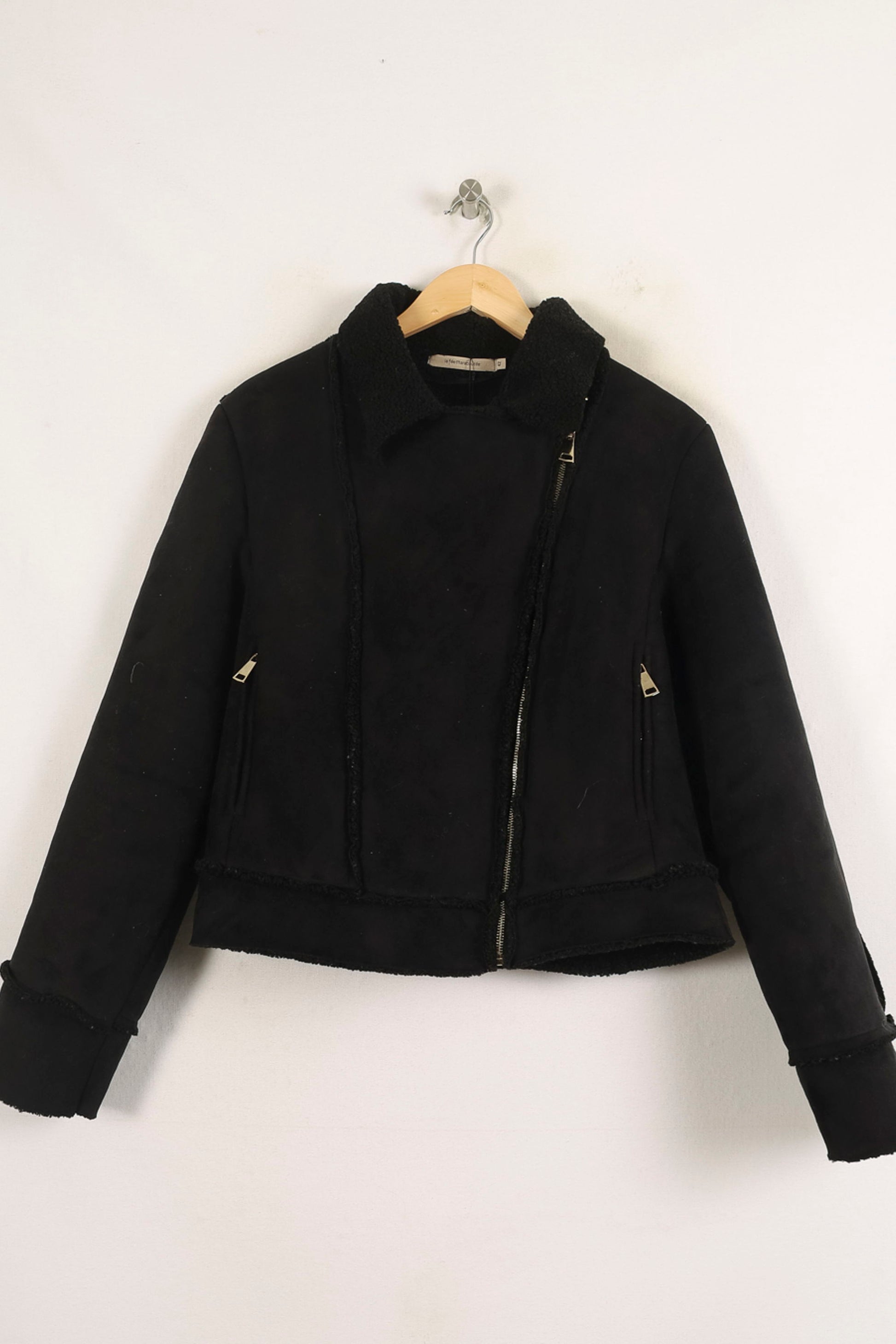Manteau noir La Fée Maraboutée, taille XL/42, fini avec une coupe et une structure, parfait pour un style moderne et élégant. La matière effet suédine, associée à un col et des bordures effet mouton donné, ainsi que le zip asymétrique, confèrent à ce manteau une allure contemporaine et singulière. Idéal pour une accompagnatrice à la tenue chic lors de votre séjour à votre rendez-vous professionnel et à votre lieu de rencontre.
