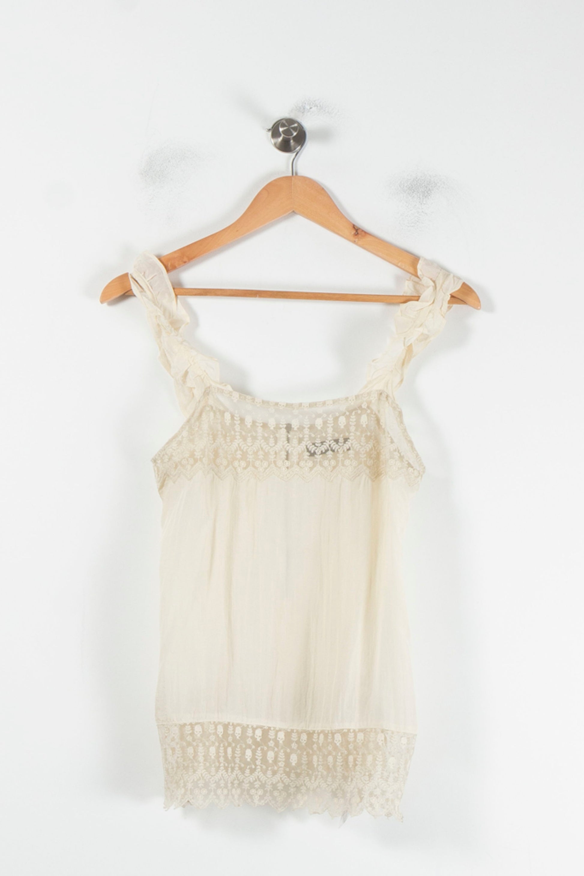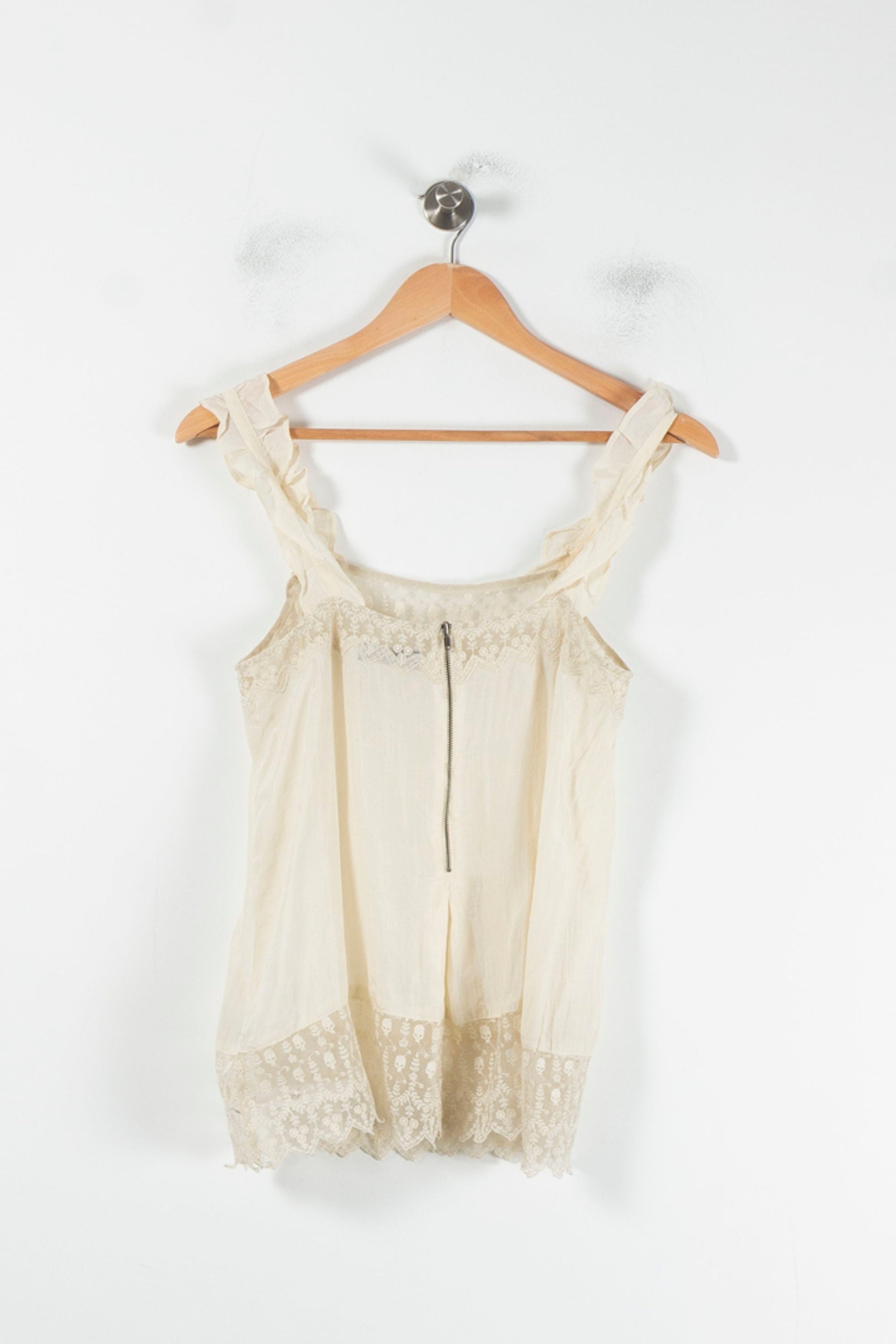 Top en soie beige The Kooples, taille S/36, arborant une délicate dentelle sur les épaules et l’encolure. Entièrement confectionné en 100% soie, ce haut se distingue par ses finitions ajourées et ses détails raffinés qui lui confèrent une élégance singulière. Parfait pour une occasion estivale, un déjeuner chic ou une soirée habillée.