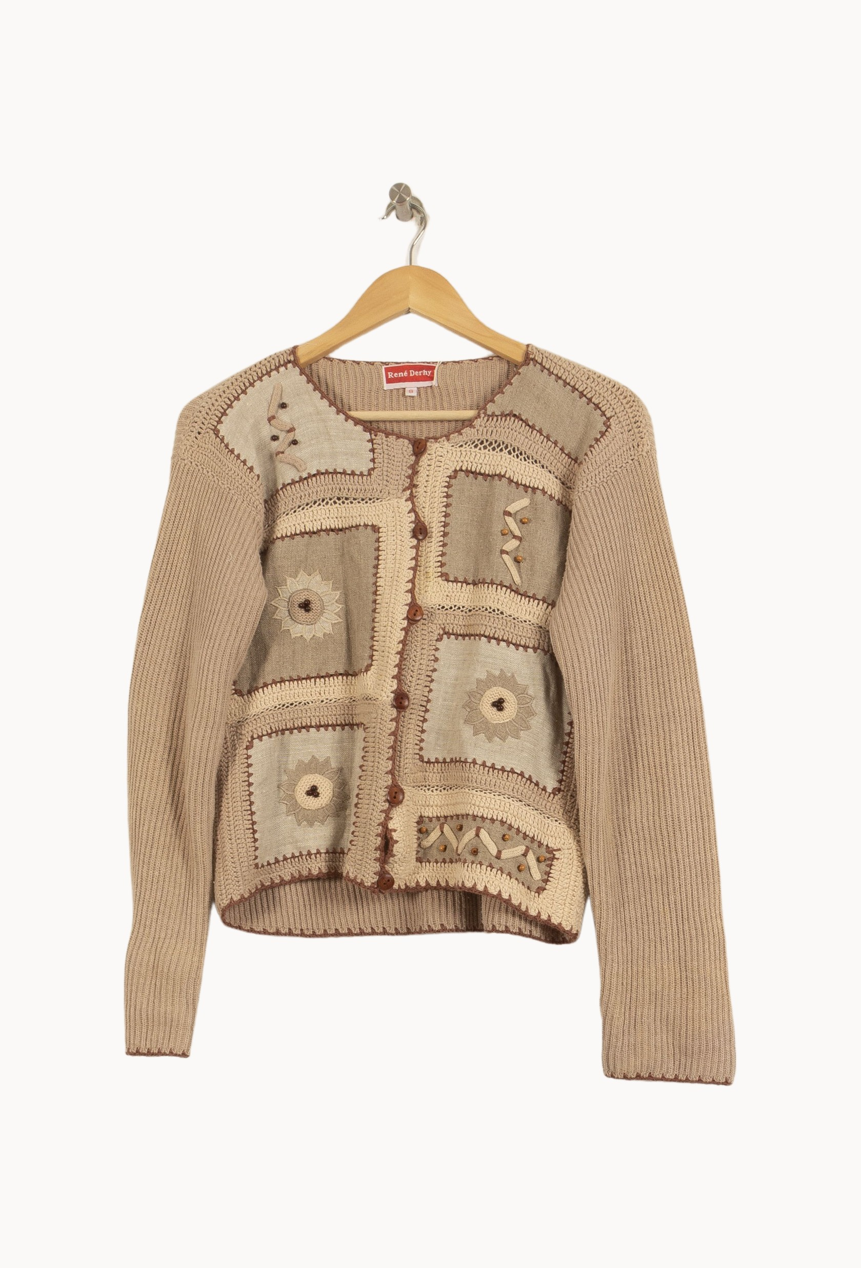 Cardigan beige Derhy, taille S/36 : pièce élégante à l’esprit artisanal, parfait pour les amatrices de pulls & cardigans uniques. Ce modèle se distingue par ses panneaux en maille ornés de motifs géométriques brodés et de détails crochetés contrastants, qui apportent originalité et charme à sa matière douce et chaleureuse. À porter lors d’une sortie décontractée ou pour ajouter une touche bohème à votre tenue de journée.